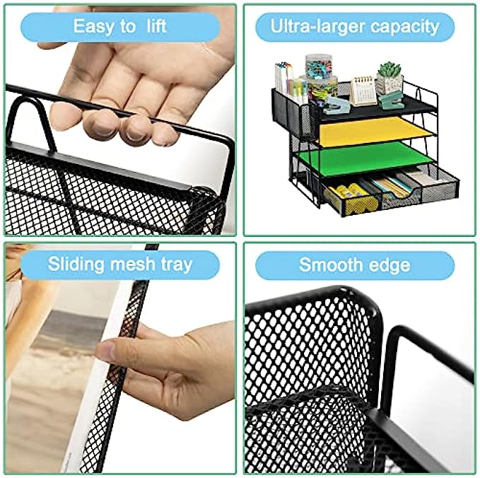 • 【Unique Mesh Desk Organizer】 This desk organizers you can organize printed paper, letters, statements, folders, documents, magazines, desk accessories. Desktop file organizer with 4 stackable trays and 1 sliding drawer + a pen holder divided in two.This desk organizer is the highest end of office organization design.