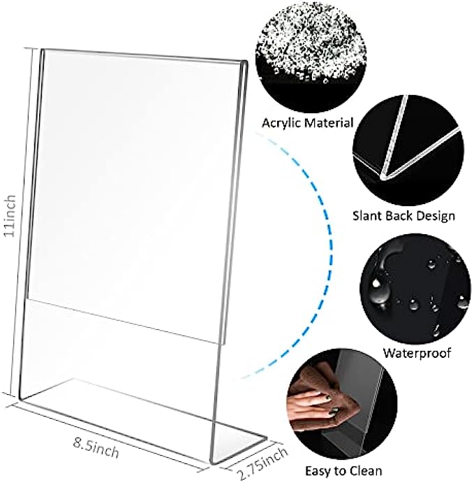8.5 X 11 Acrylic Sign Holder Slant Back Design Plastic Display Stand Clear Table Single Sheet Portrait Ad Frames Paper Holder for Home, Office, Store, Restaraunt - 8 Pack (8)