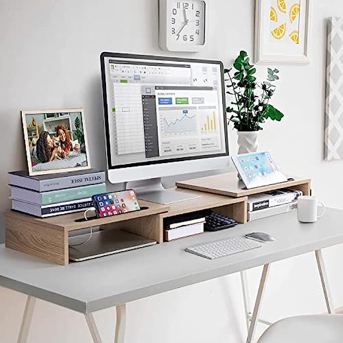 • GET A TIDY WORKING SPACE: Lift your monitors by the desktop shelf and store your keyboard, office files, notebook, calculator underneath it. Get rid of messy desk, keeps your working space tidy.