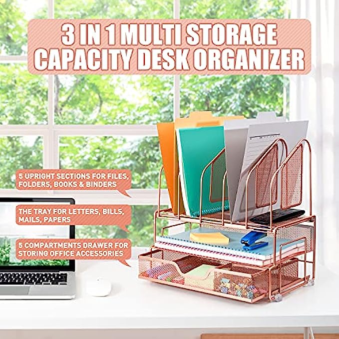 Beiz Rose Gold Desk Organizer with Storage Drawer, 2 Paper Tray & 5 Upright Slots File Folder Holders Desktop Organizers, Cute Desk Supplies for Women Office Home School