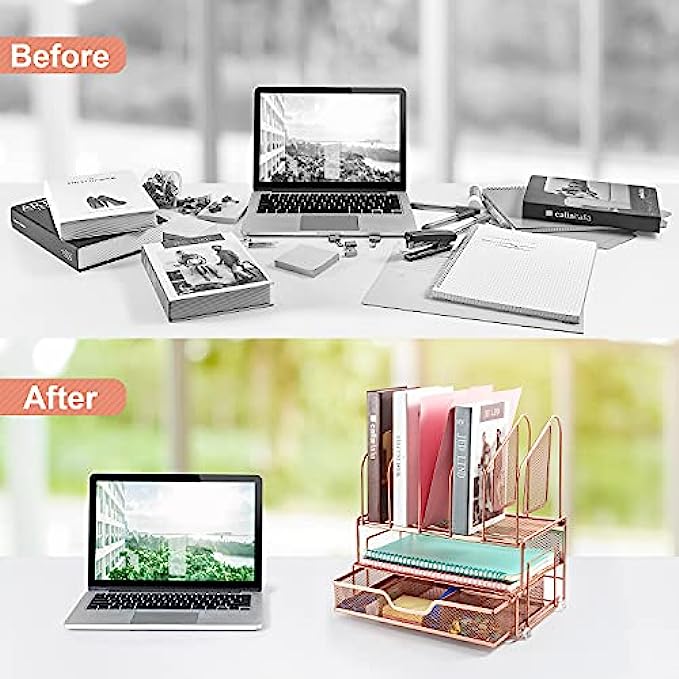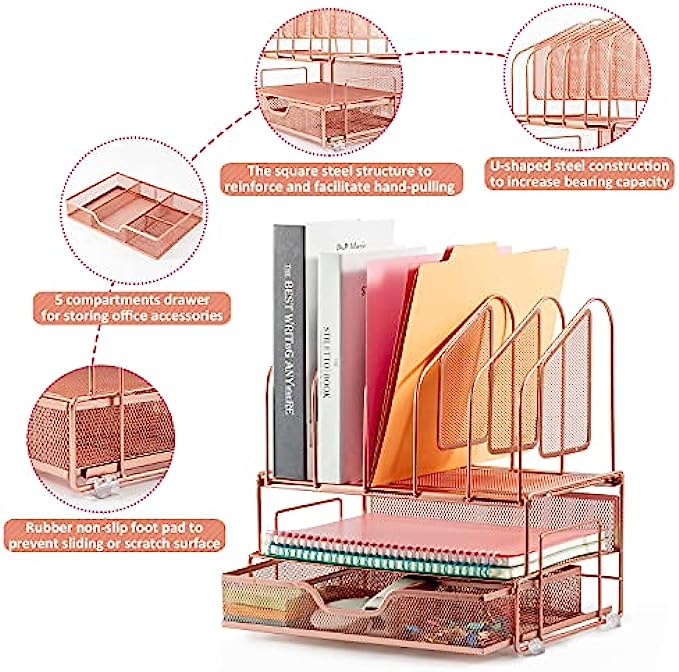 • LARGE CAPACITY AND STABLE: rose gold desk organizer is eye-catching and attrac attention, which made of steel, it is more stable than normal desk organization. It is convenient to arrange documents, paper, file, folder in one place for quick and easy access