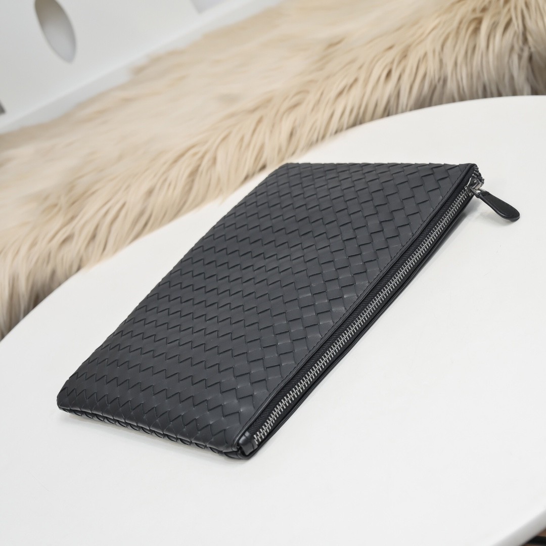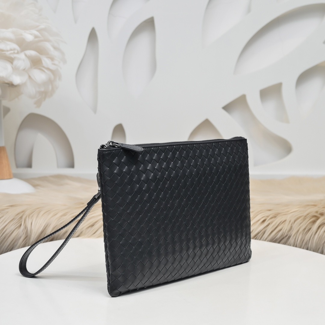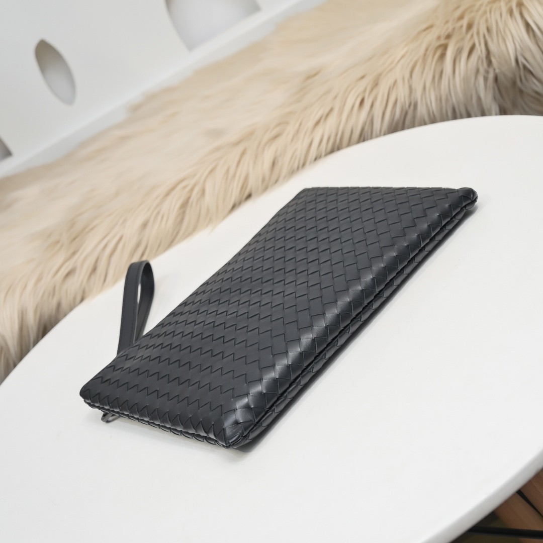 【BOTTEGA VENETA 寶緹嘉】Intrecciato 小牛皮手拿包|全黑編織皮革 × 簡約高質感 × 商務休閒兩用