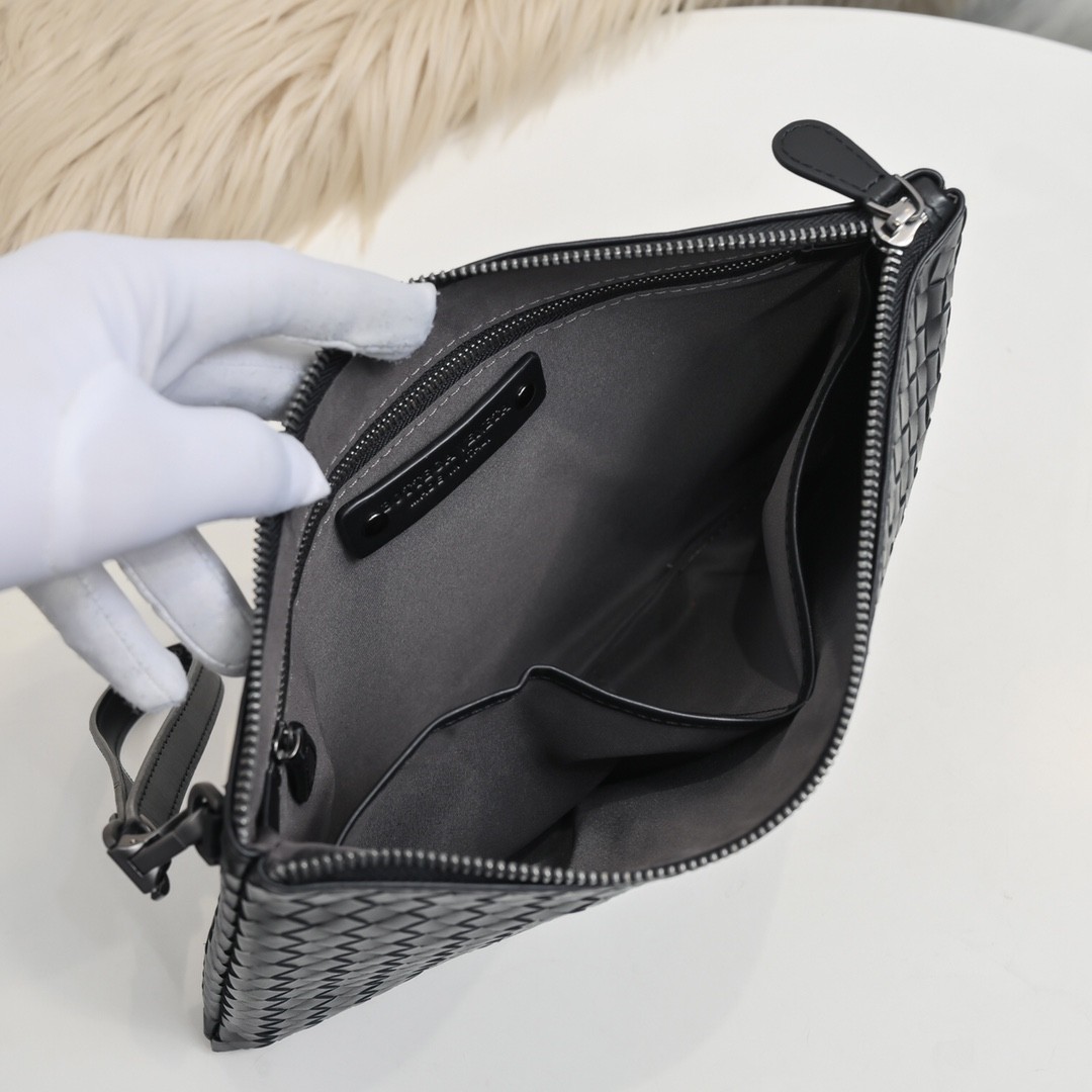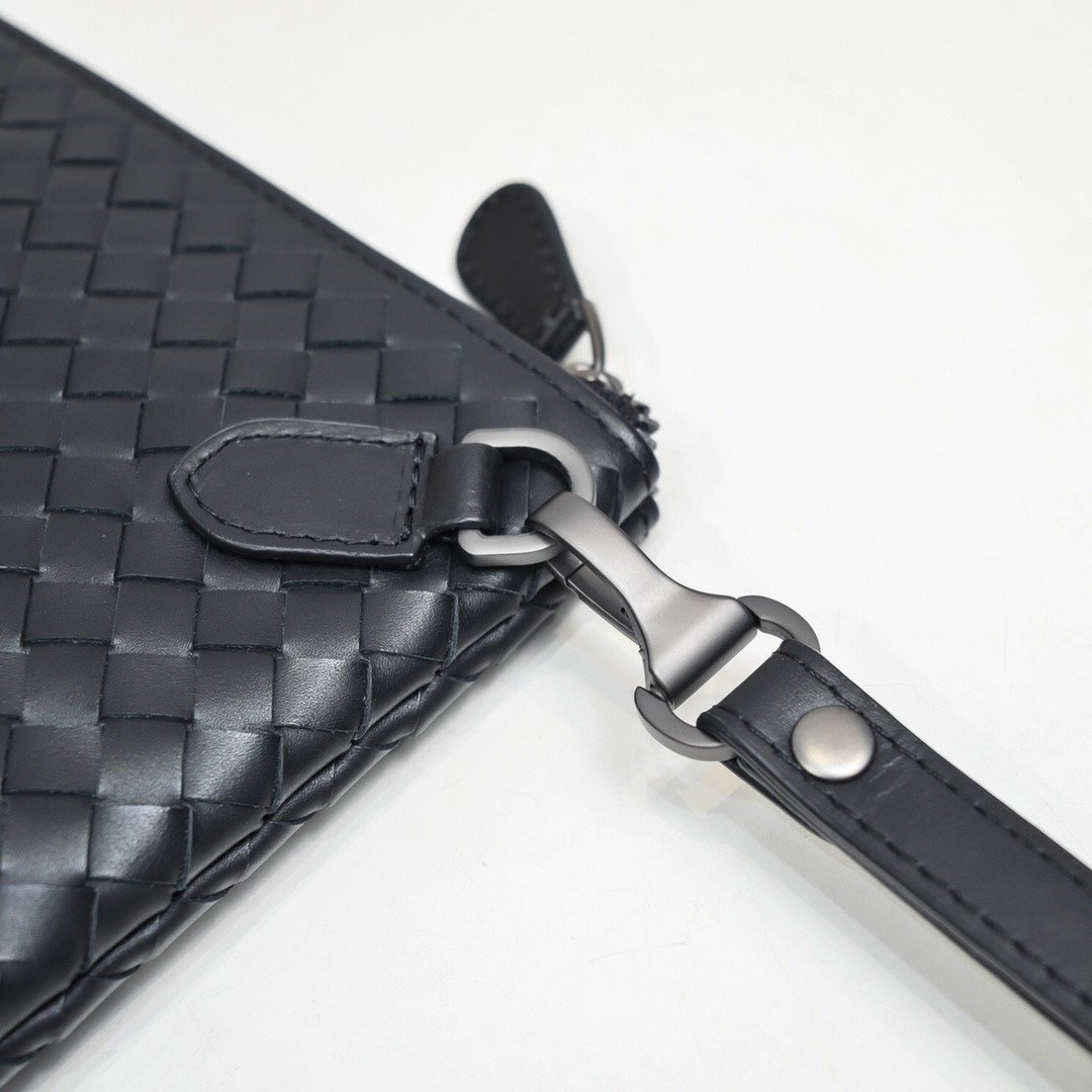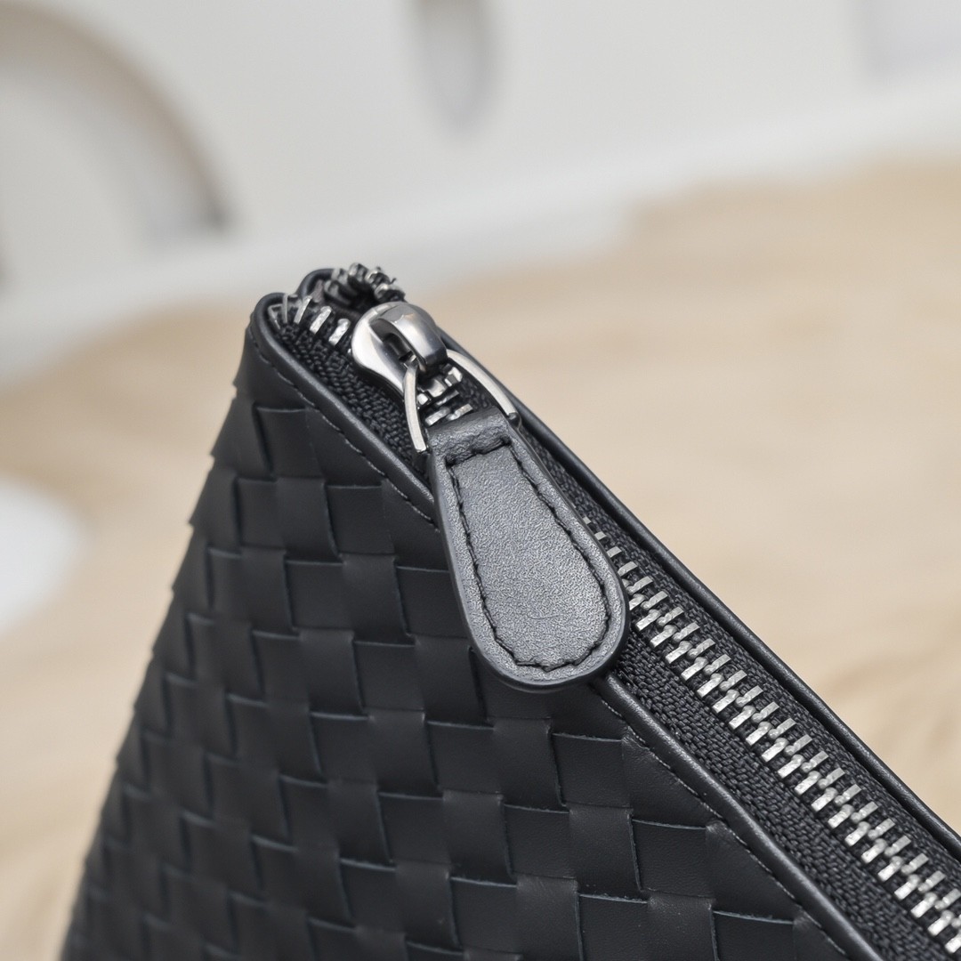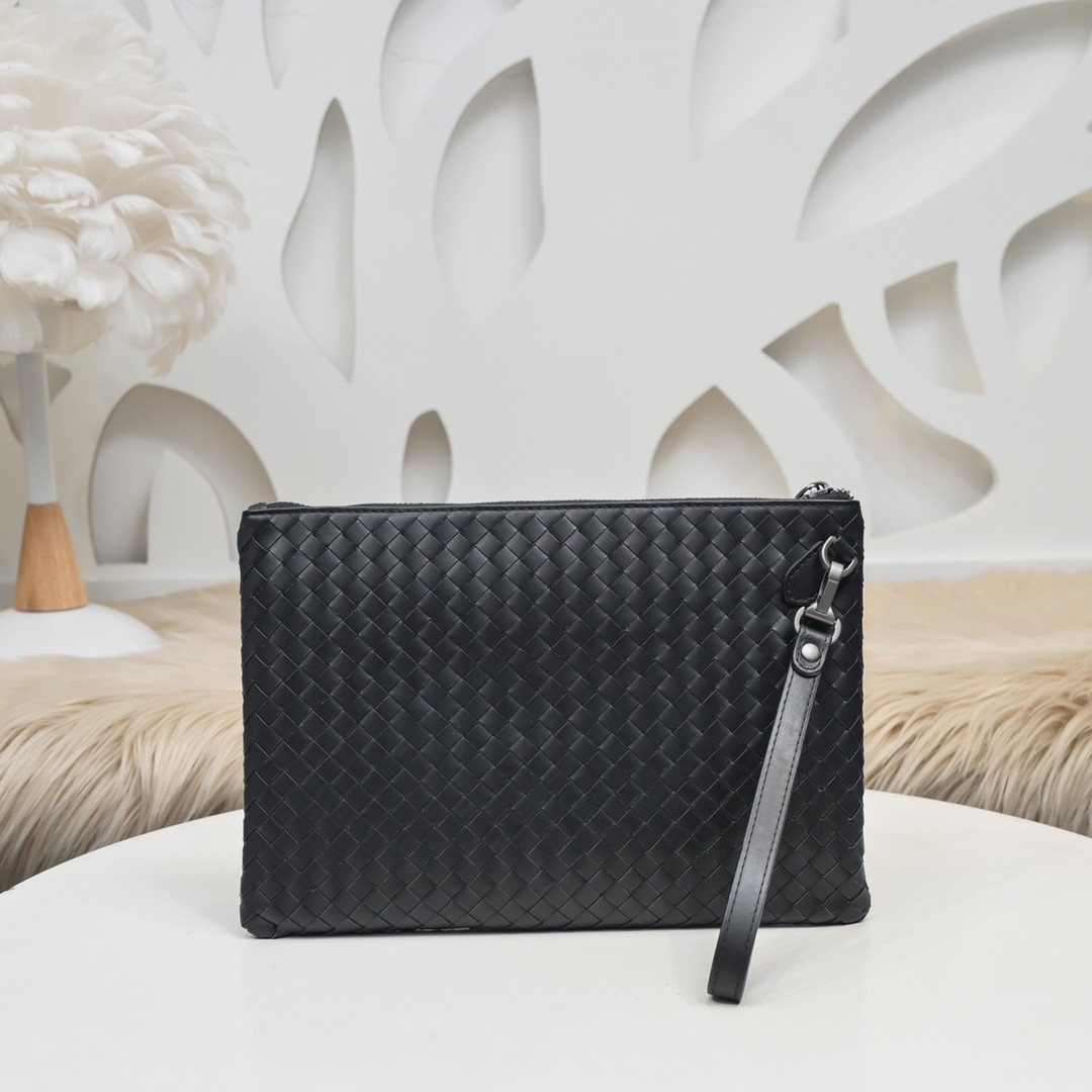 【BOTTEGA VENETA 寶緹嘉】Intrecciato 小牛皮手拿包|全黑編織皮革 × 簡約高質感 × 商務休閒兩用