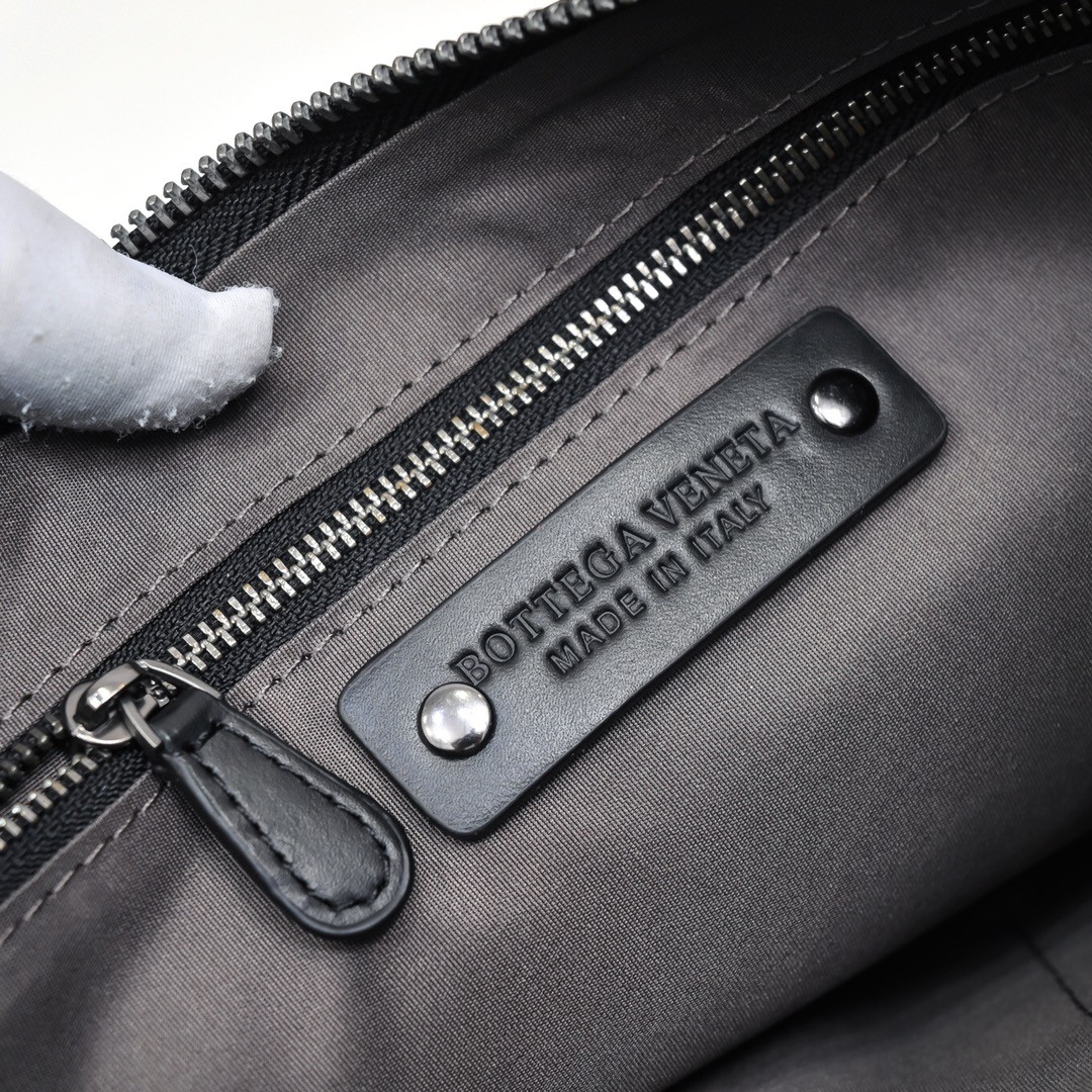 【BOTTEGA VENETA 寶緹嘉】Intrecciato 條紋拼接手拿包|黑灰編織 × 金屬拉鍊 × 精品質感