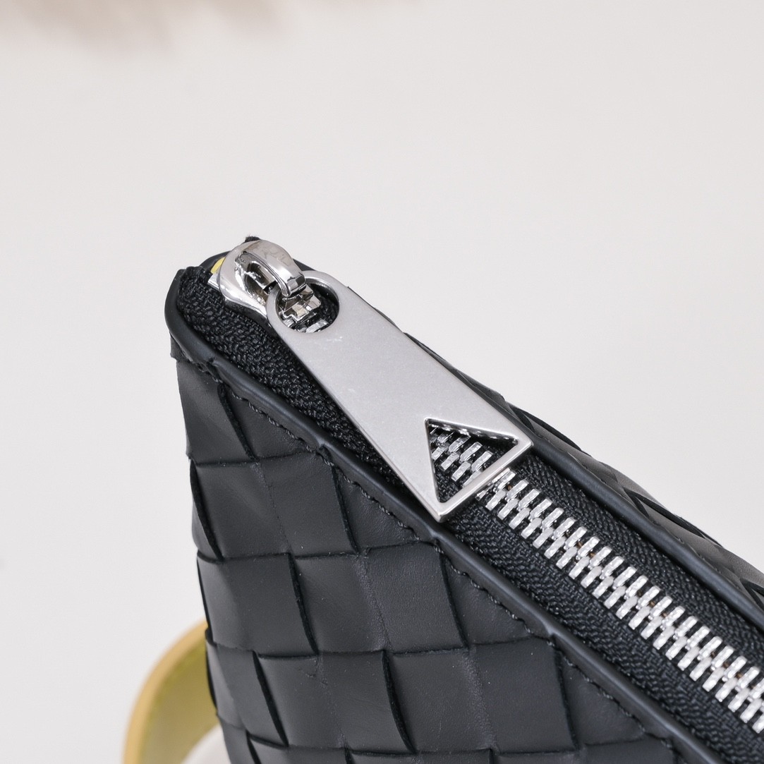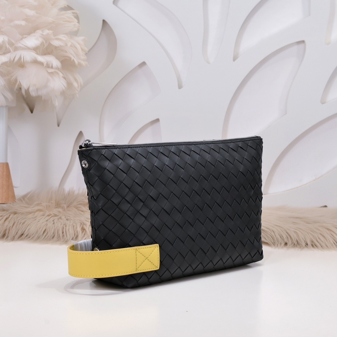 【BOTTEGA VENETA 寶緹嘉】Intrecciato 條紋拼接手拿包|黑灰編織 × 金屬拉鍊 × 精品質感