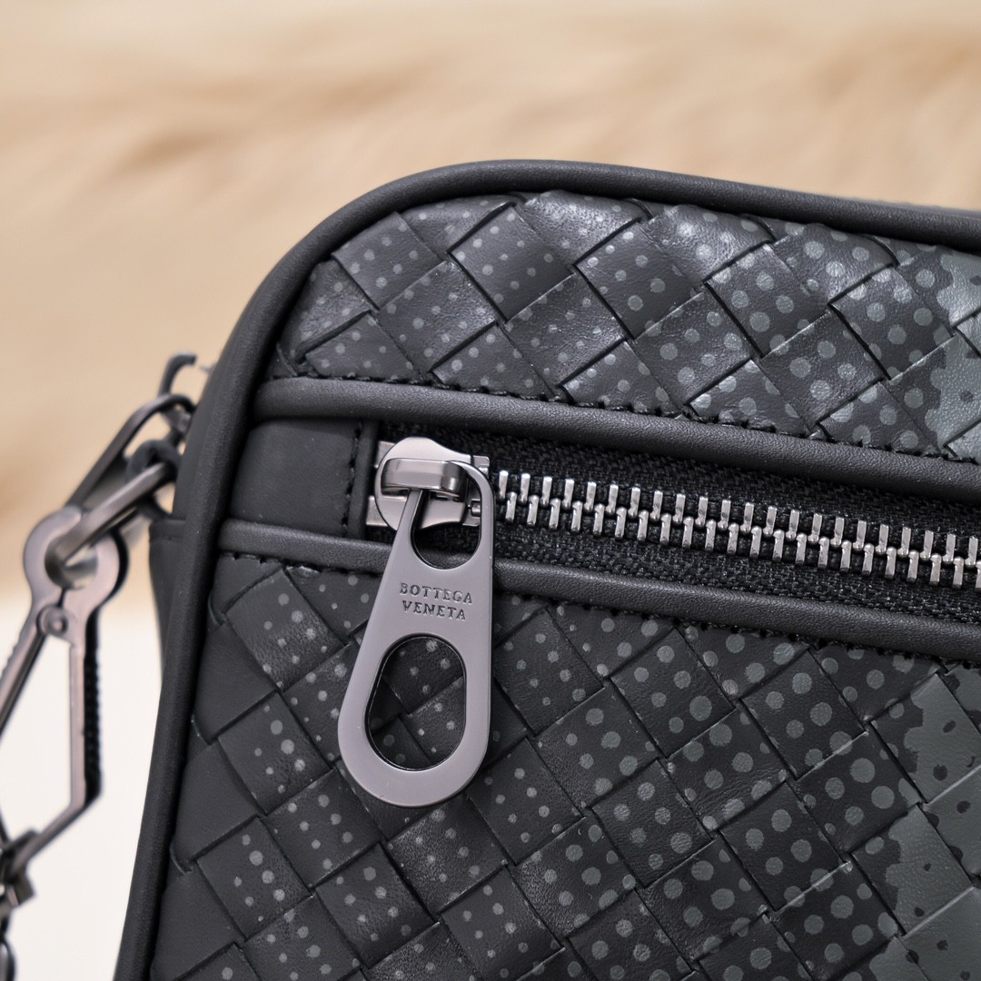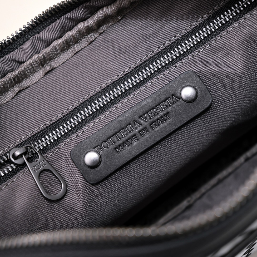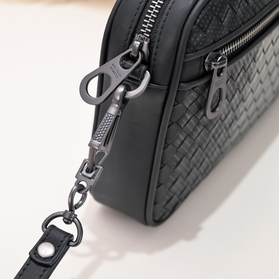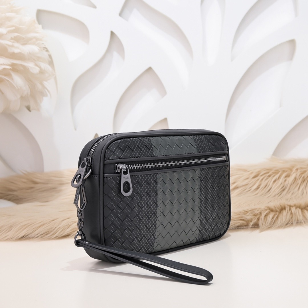 【BOTTEGA VENETA 寶緹嘉】Intrecciato 條紋拼接手拿包|黑灰編織 × 金屬拉鍊 × 精品質感