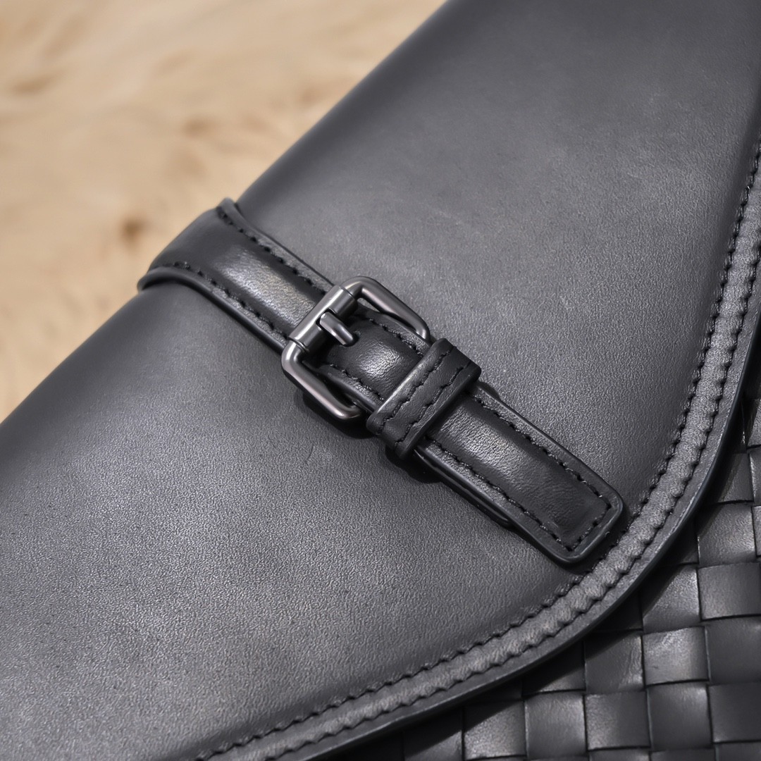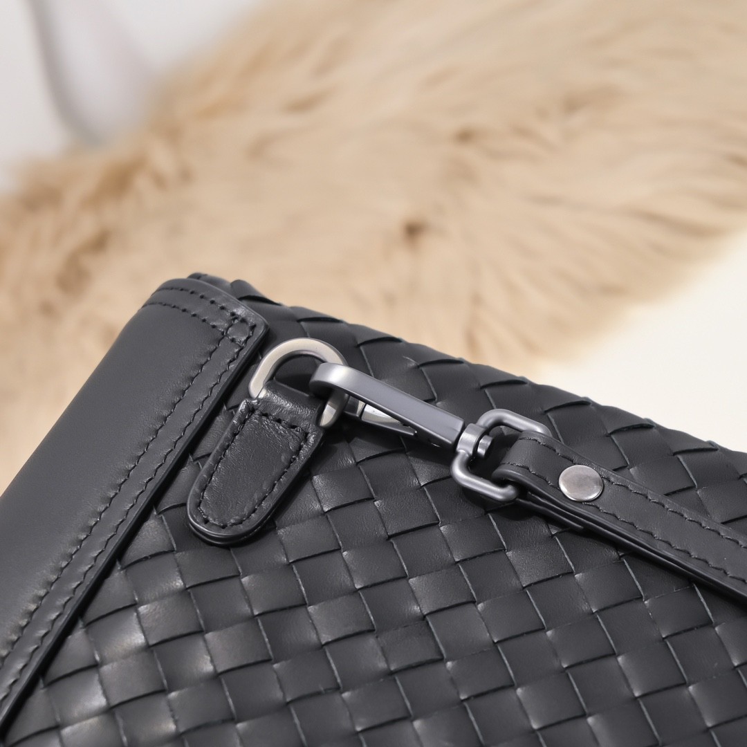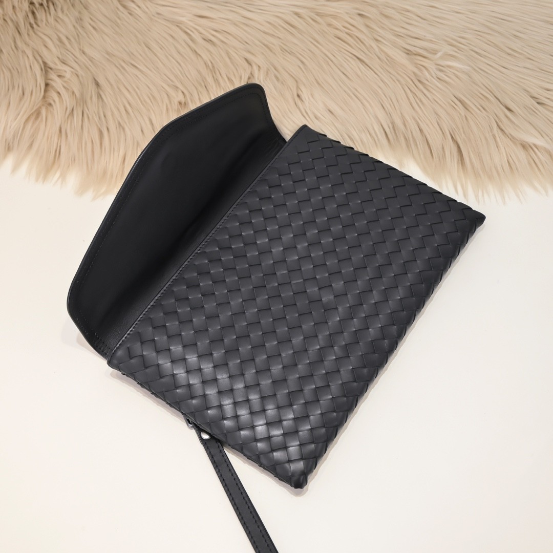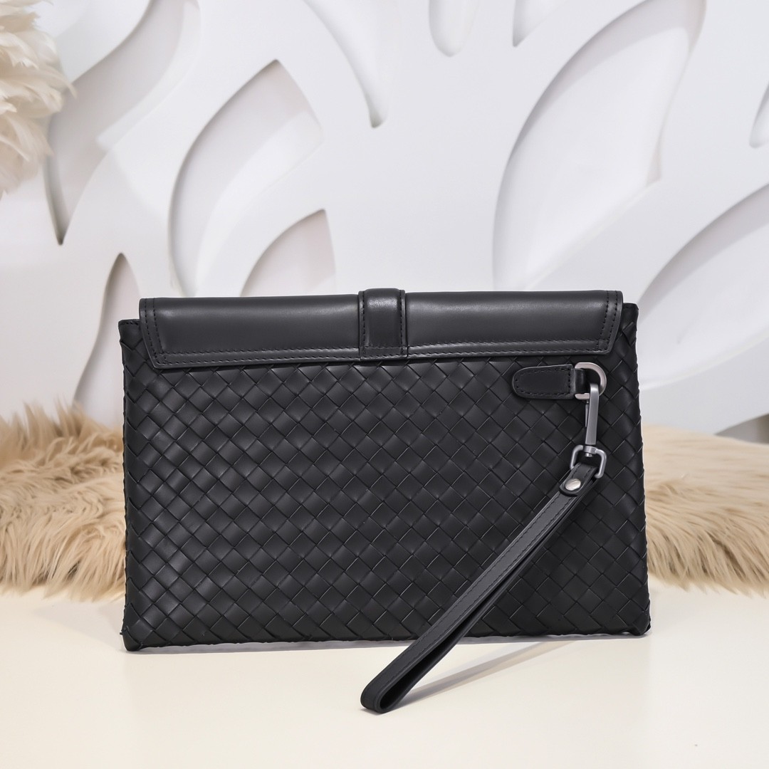【BOTTEGA VENETA 寶緹嘉】Intrecciato 扣帶信封手拿包|黑色編織 × 真皮拼接 × 義式簡約風