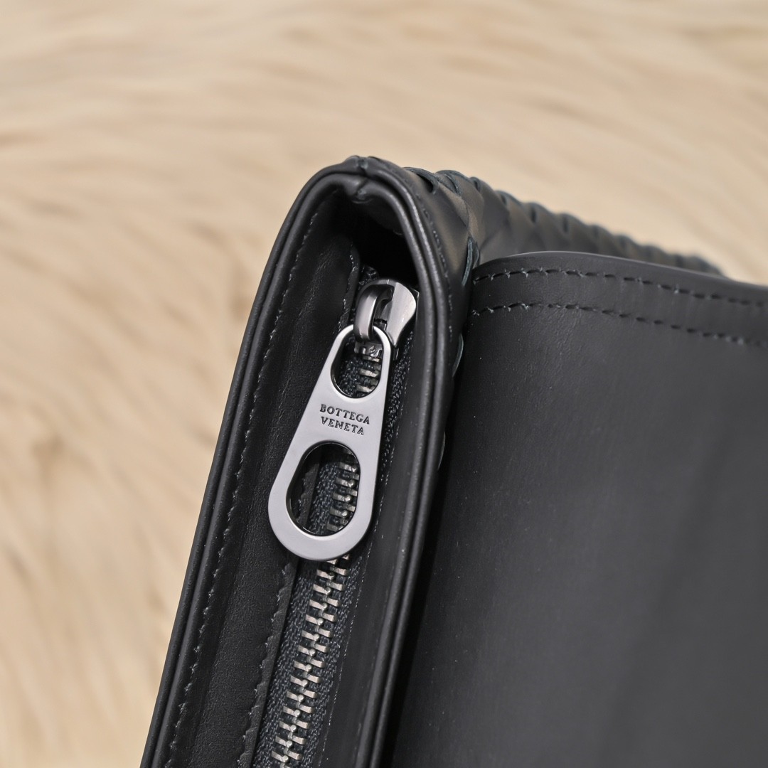 【BOTTEGA VENETA 寶緹嘉】Intrecciato 條紋拼接手拿包|黑灰編織 × 金屬拉鍊 × 精品質感