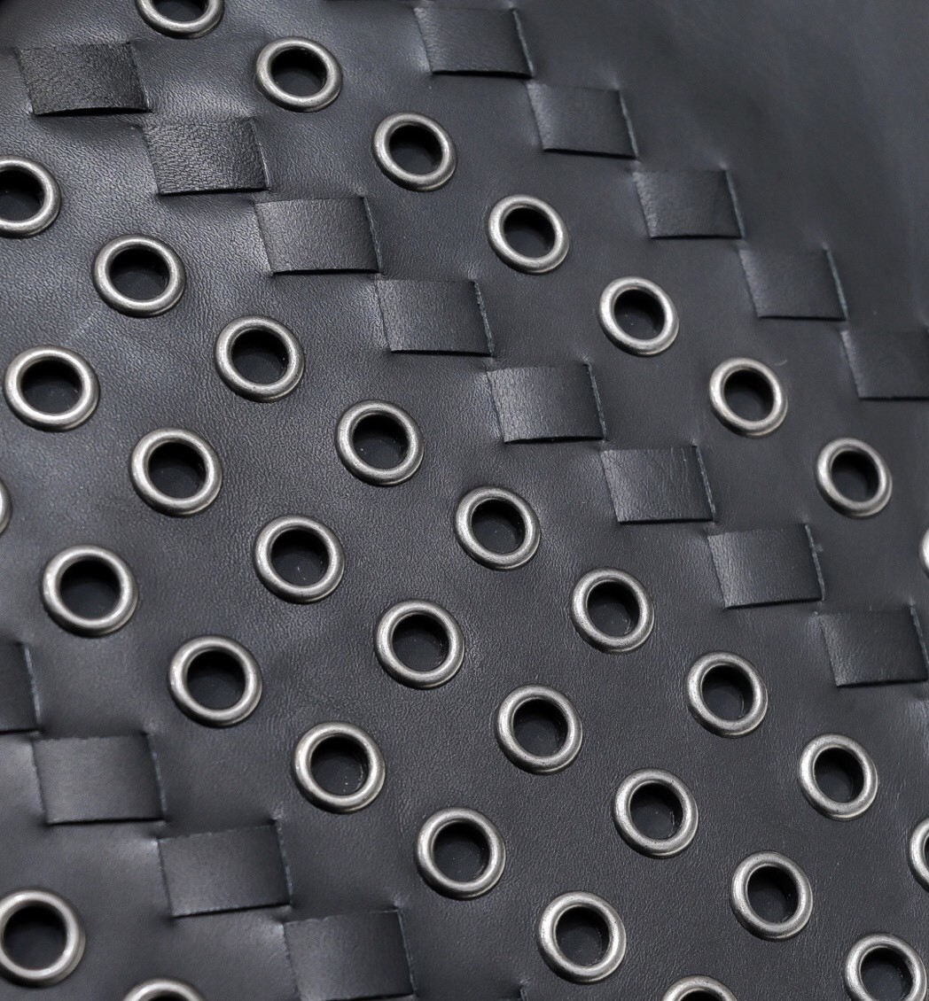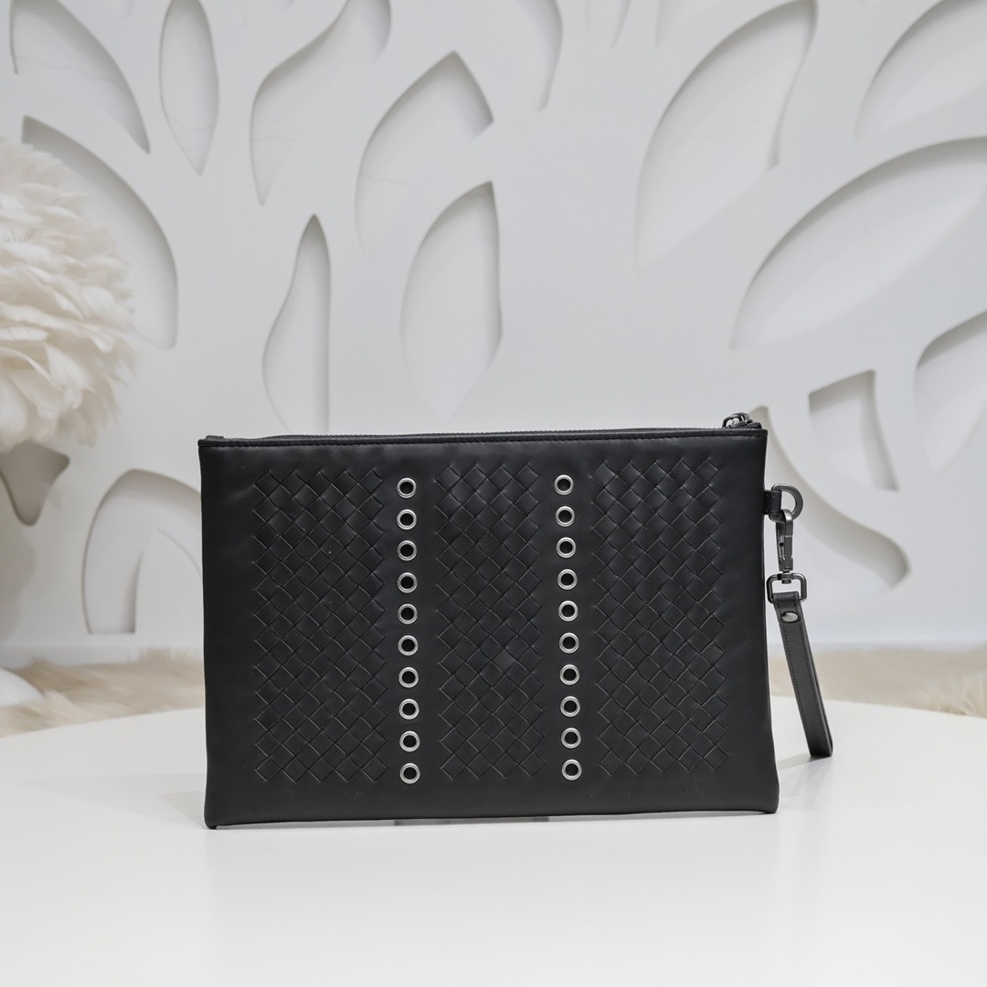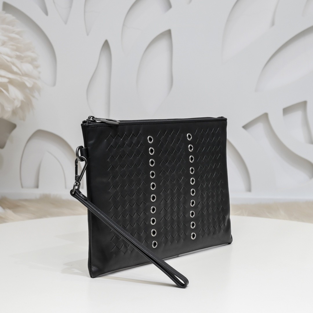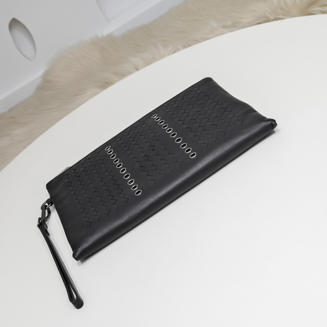 【BOTTEGA VENETA 寶緹嘉】Intrecciato 金屬鉚孔手拿包|黑色編織 × 工業風設計 × 義式質感