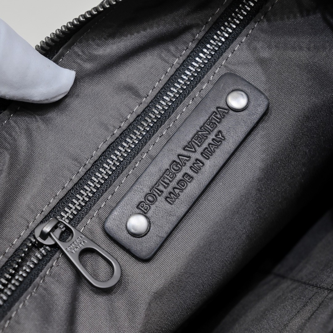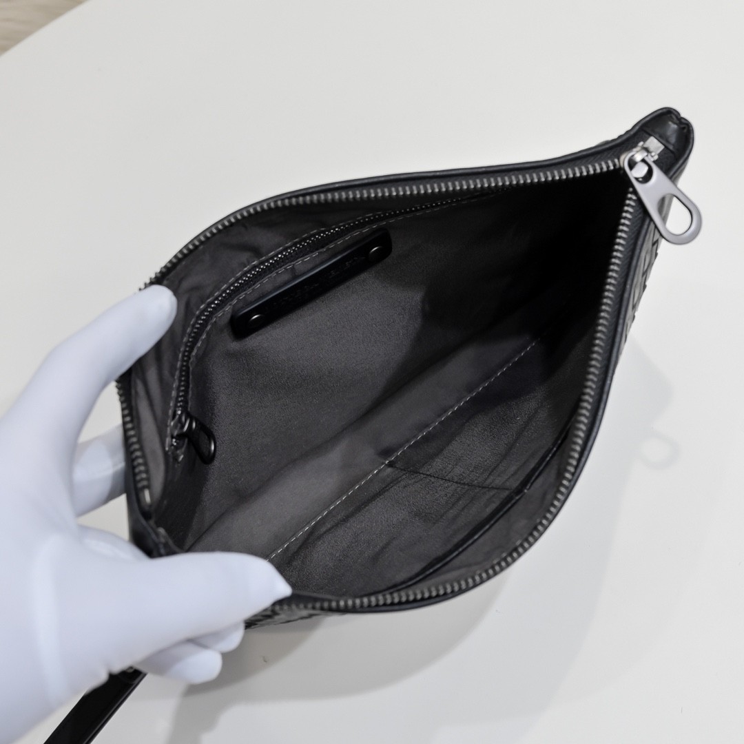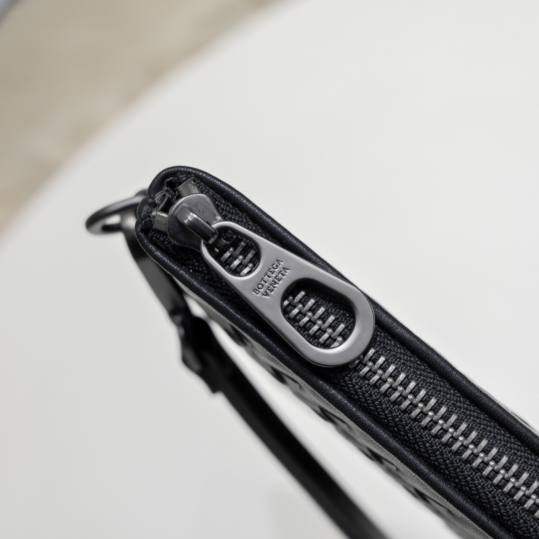 【BOTTEGA VENETA 寶緹嘉】Intrecciato 條紋拼接手拿包|黑灰編織 × 金屬拉鍊 × 精品質感