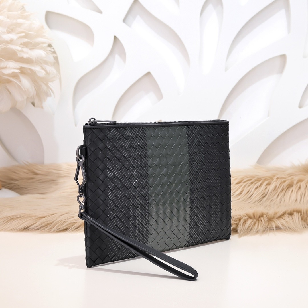 【BOTTEGA VENETA 寶緹嘉】Intrecciato 條紋拼接手拿包|黑灰編織 × 金屬拉鍊 × 精品質感