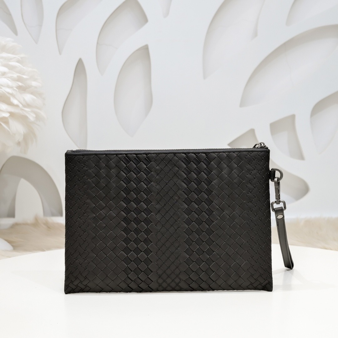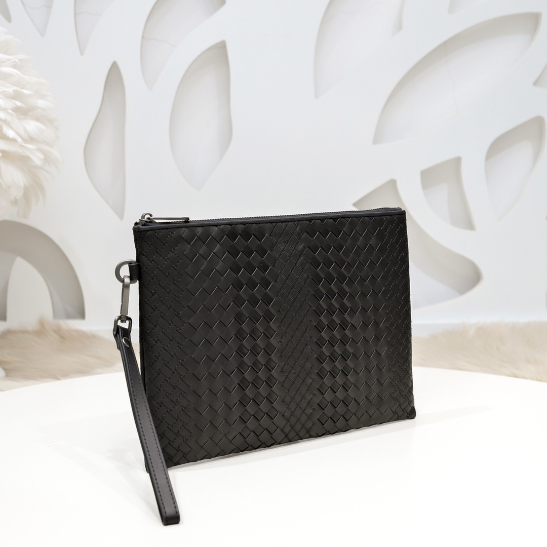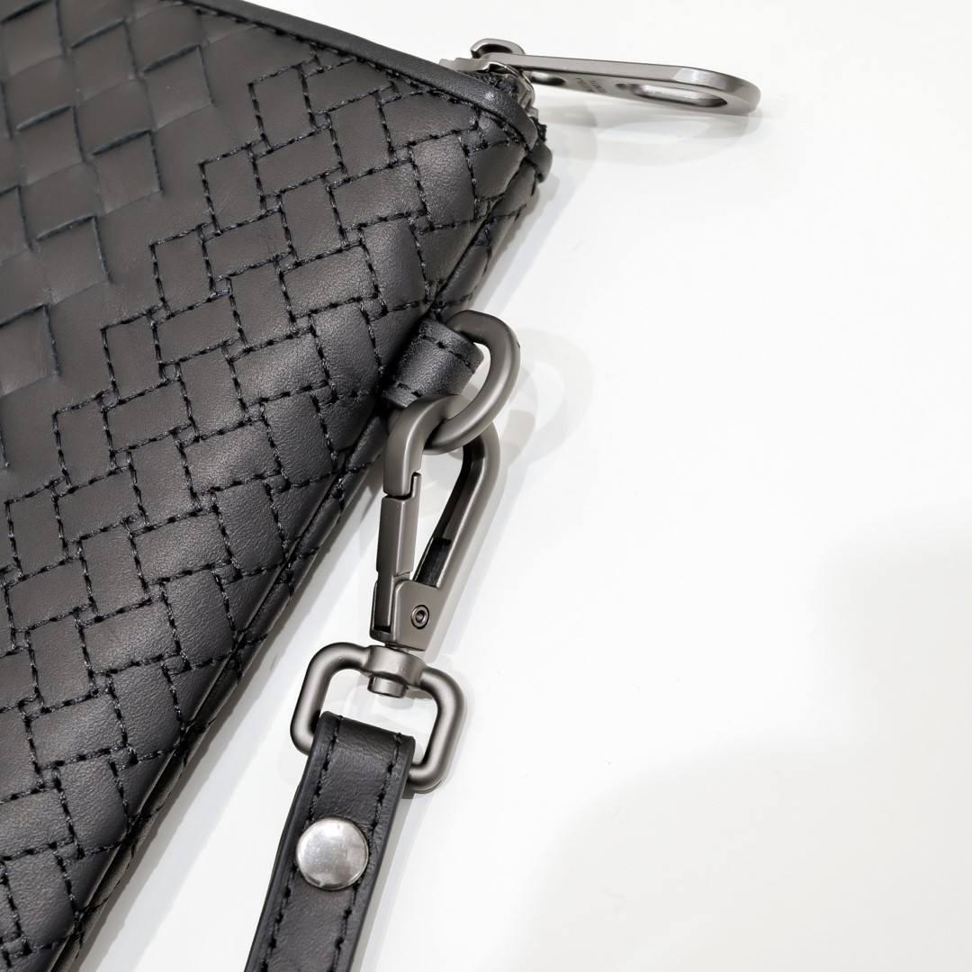 【BOTTEGA VENETA 寶緹嘉】Intrecciato 條紋拼接手拿包|黑灰編織 × 金屬拉鍊 × 精品質感