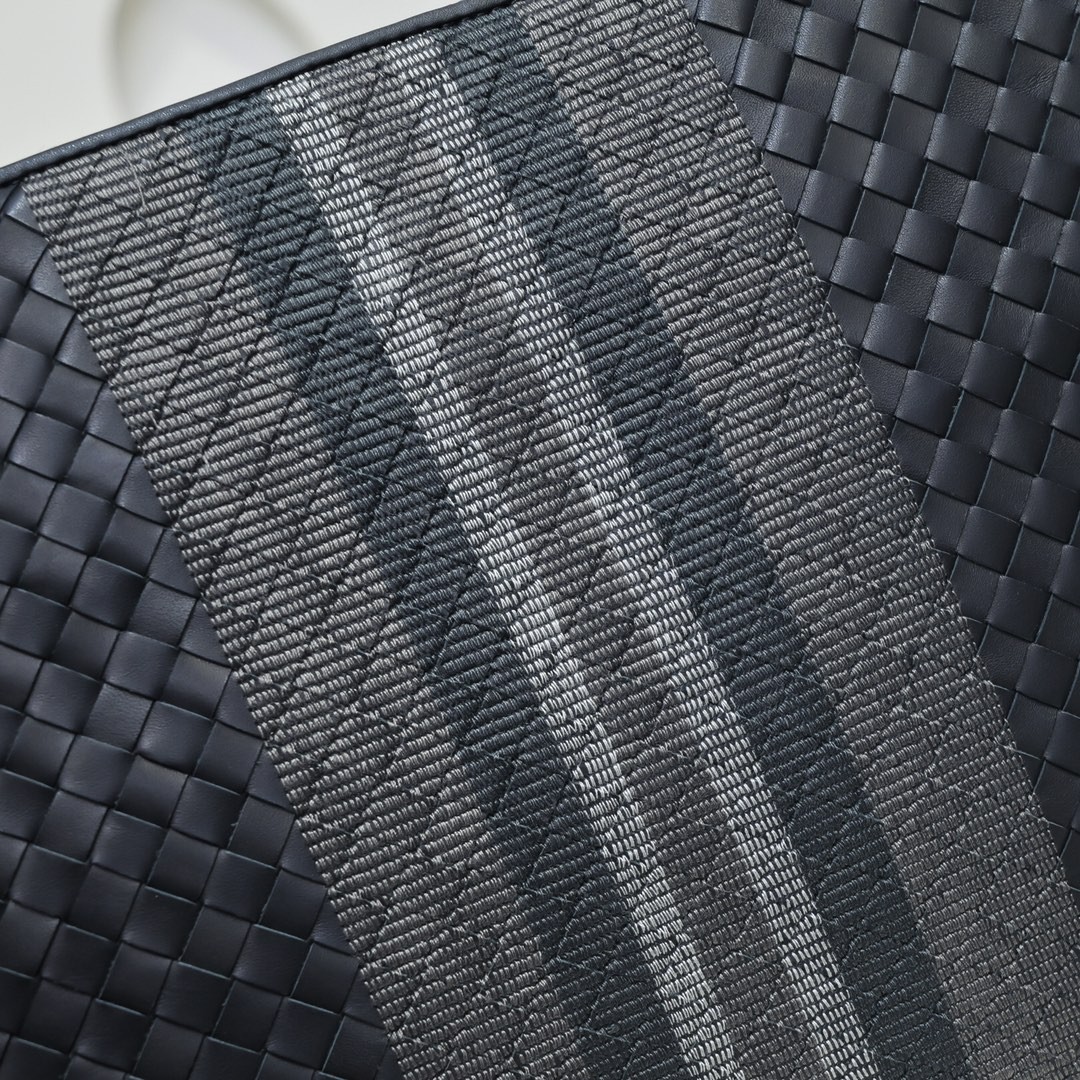 【BOTTEGA VENETA 寶緹嘉】Intrecciato 拼色條紋手拿包|黑灰拼接 × 編織皮革 × 義式極簡風