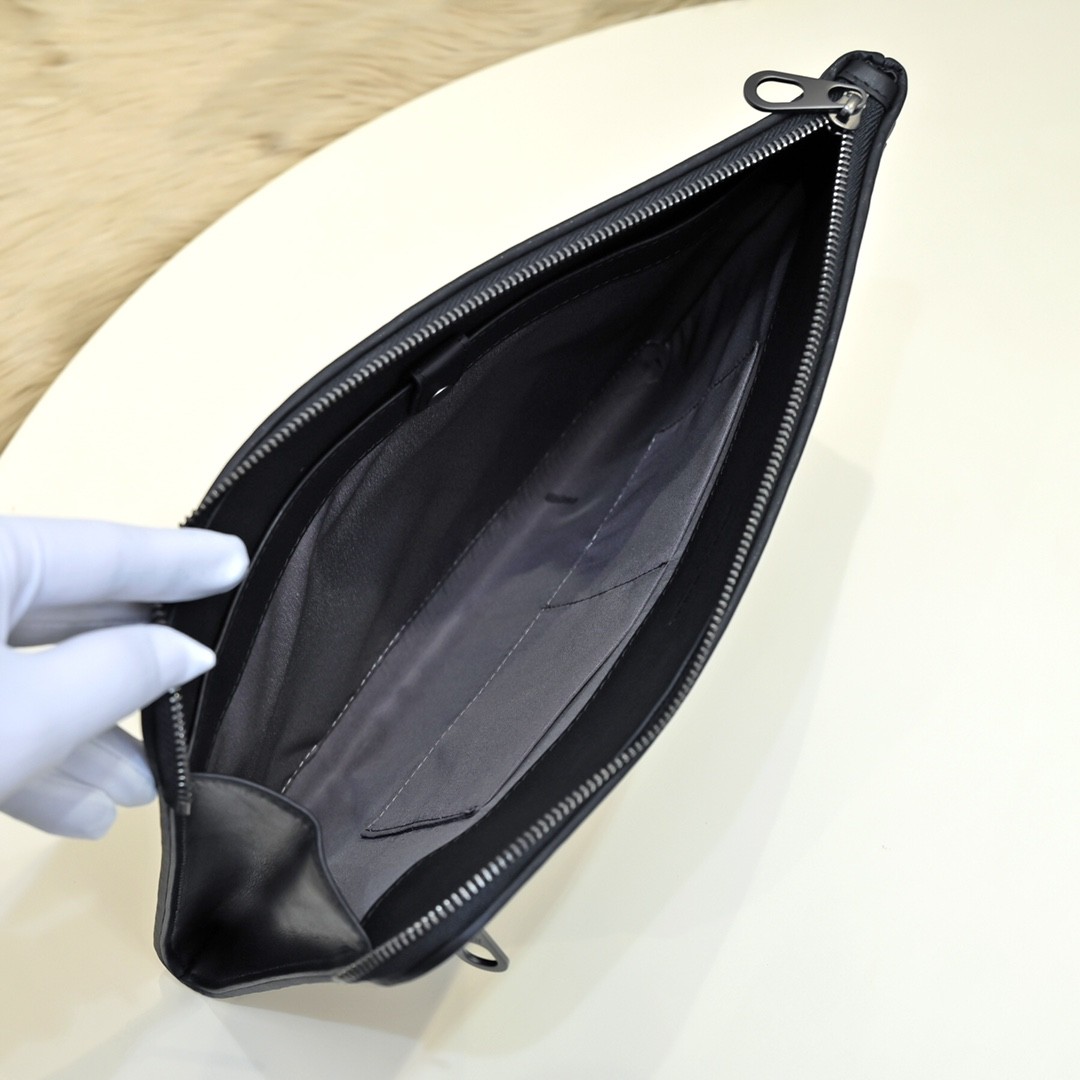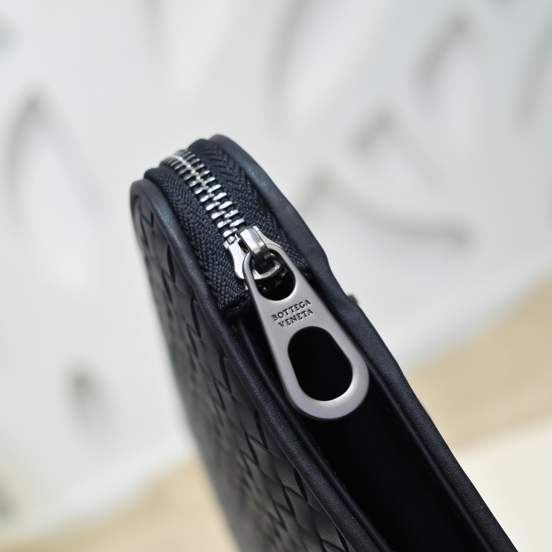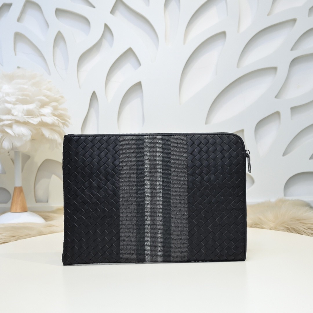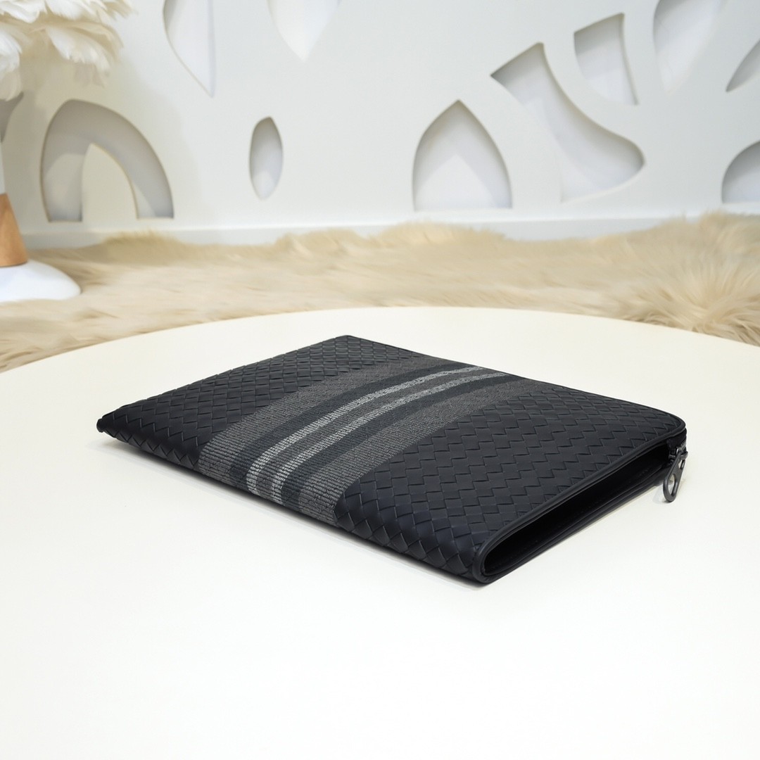 【BOTTEGA VENETA 寶緹嘉】Intrecciato 條紋拼接手拿包|黑灰編織 × 金屬拉鍊 × 精品質感