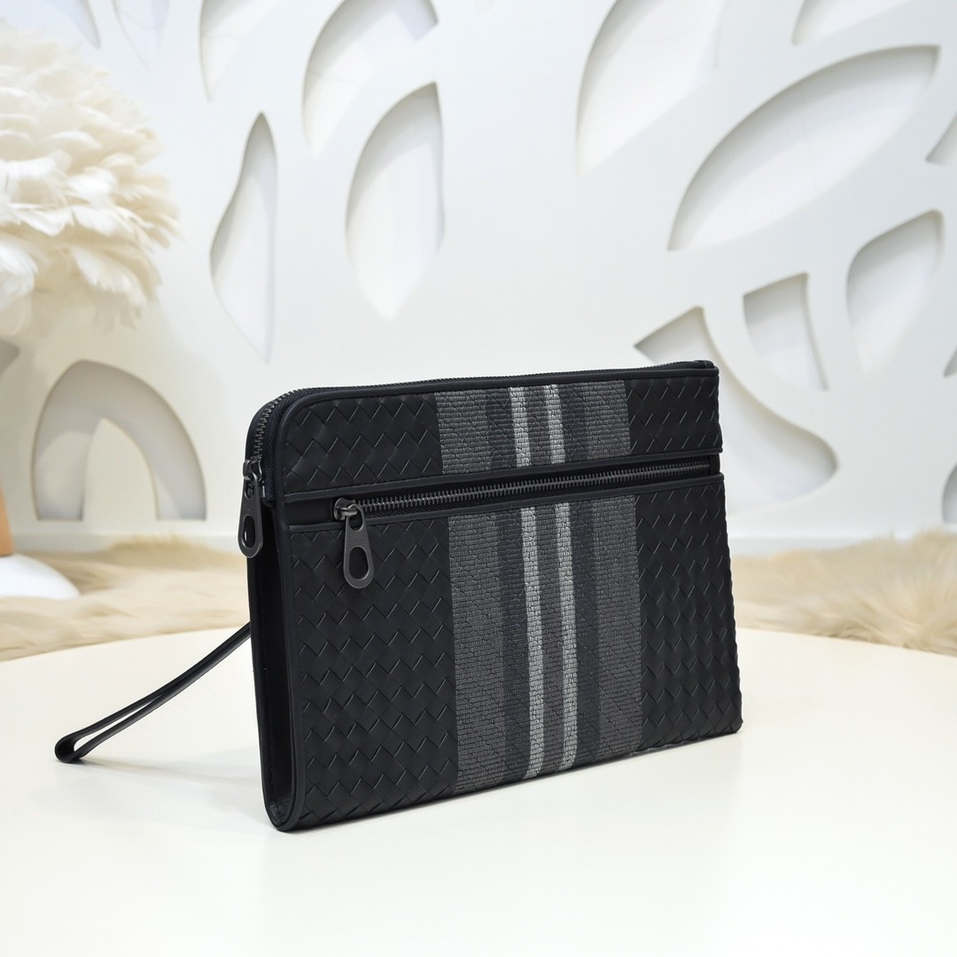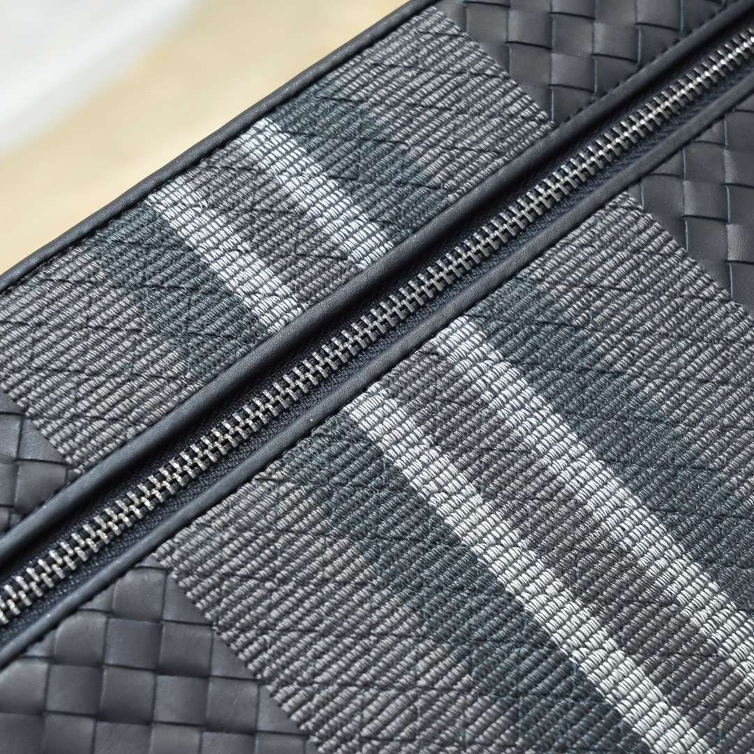 【BOTTEGA VENETA 寶緹嘉】Intrecciato 條紋拼接手拿包|黑灰編織 × 金屬拉鍊 × 精品質感