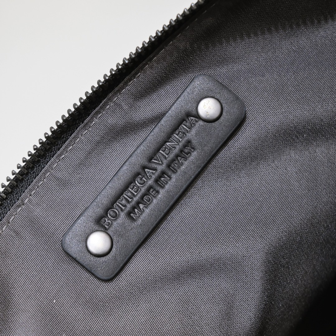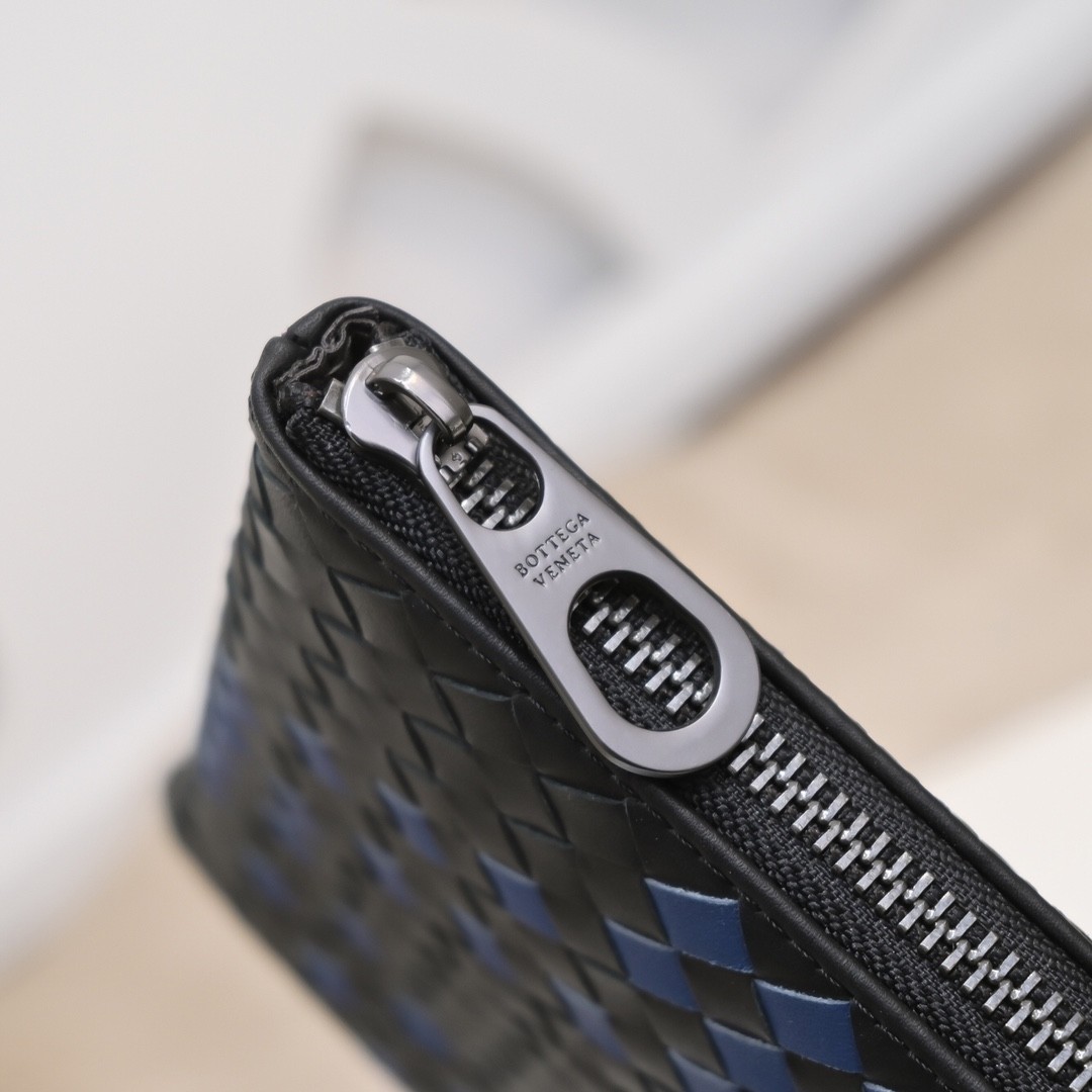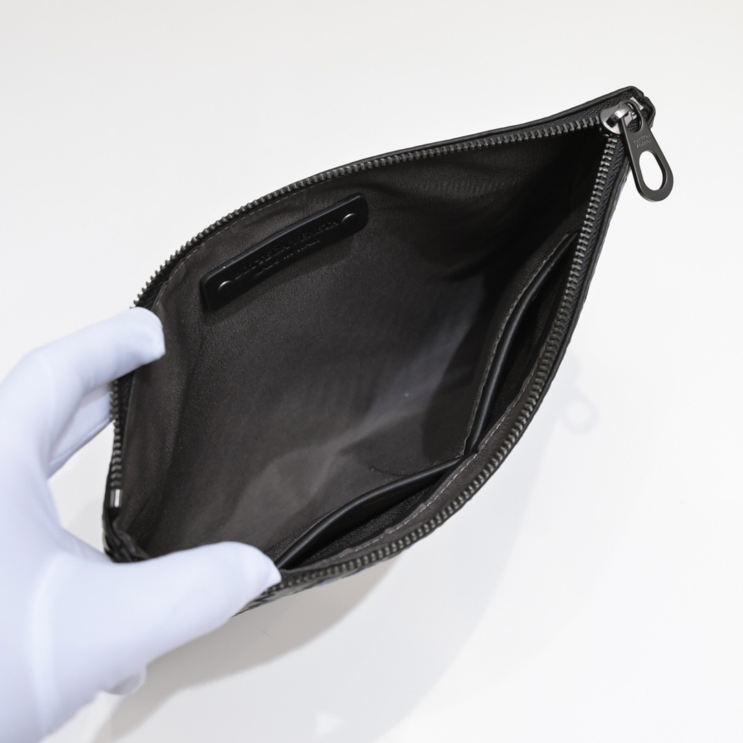 【BOTTEGA VENETA 寶緹嘉】Intrecciato 條紋拼接手拿包|黑灰編織 × 金屬拉鍊 × 精品質感