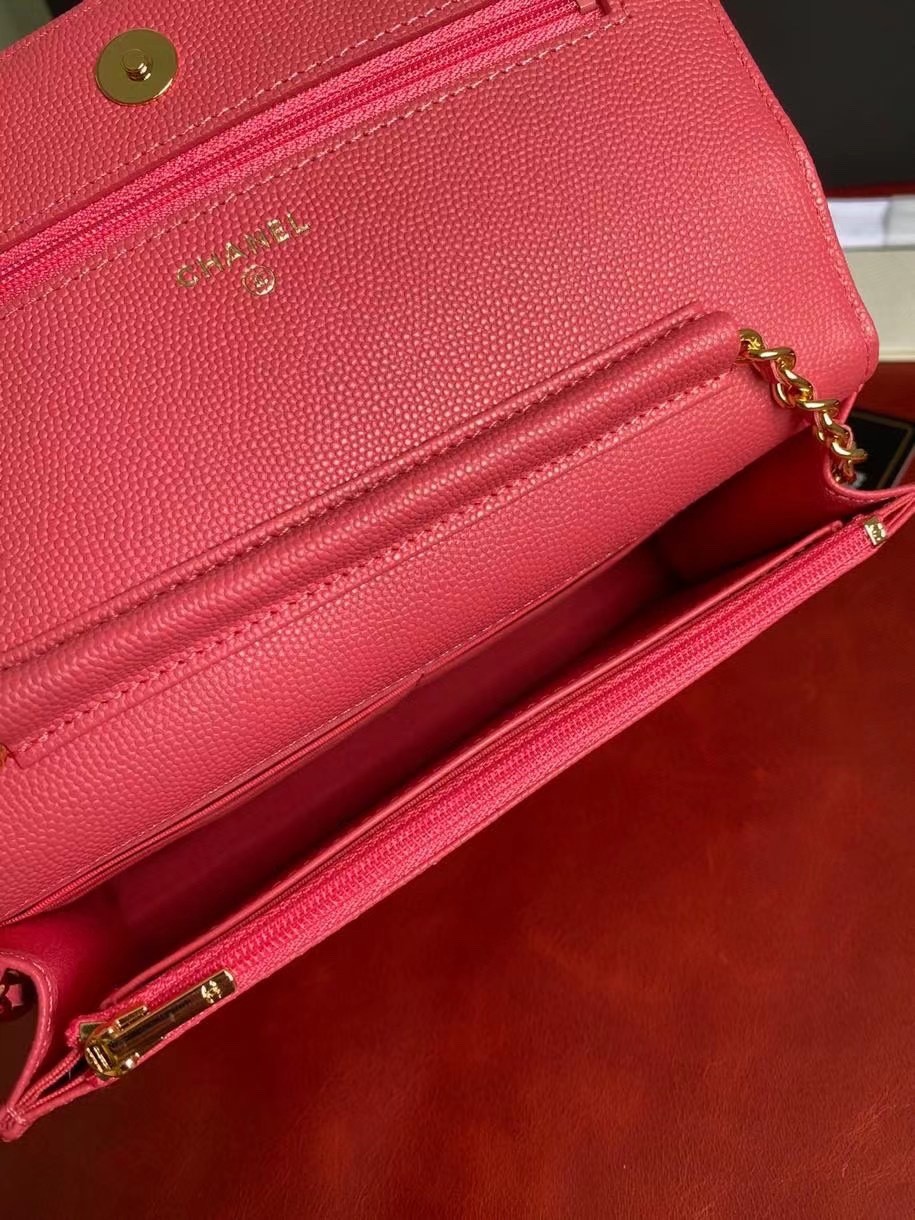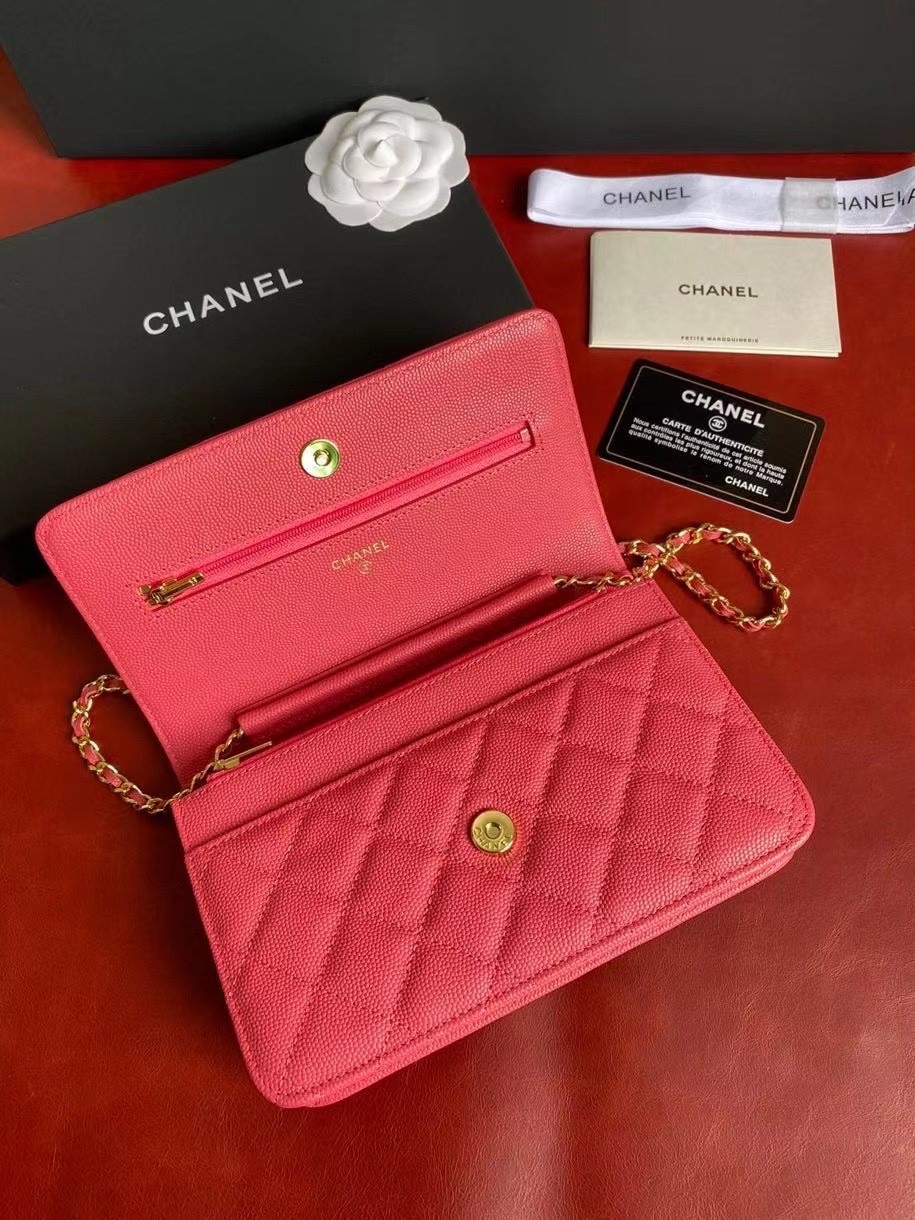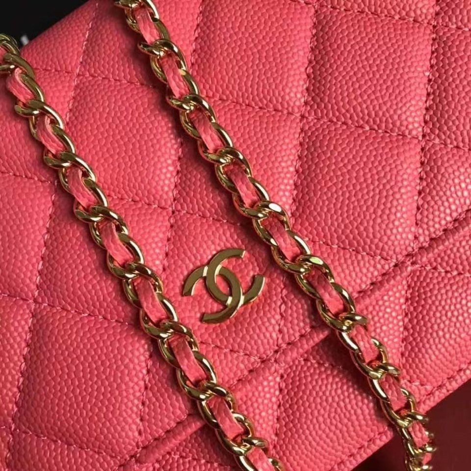 CHANEL經典菱格紋雙C粒面牛皮WOC 桃紅