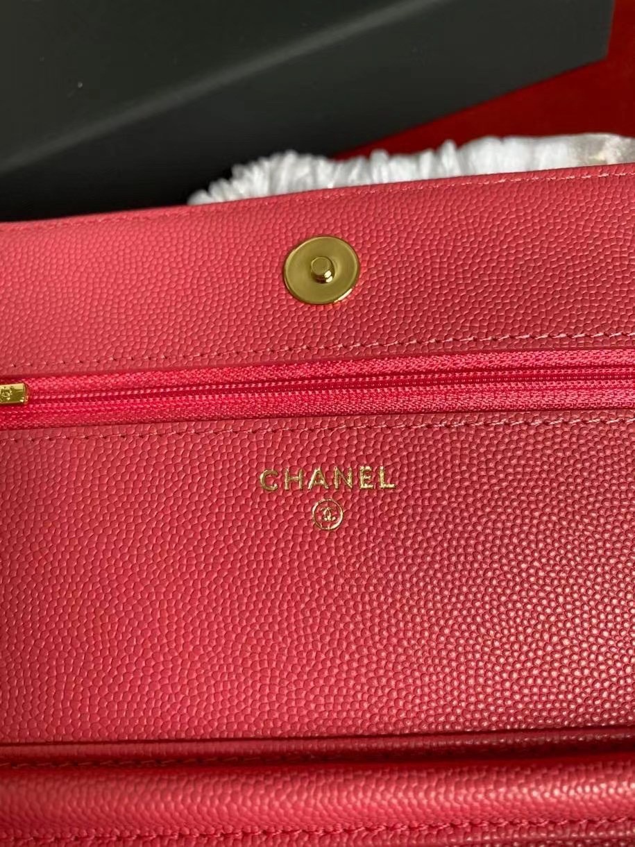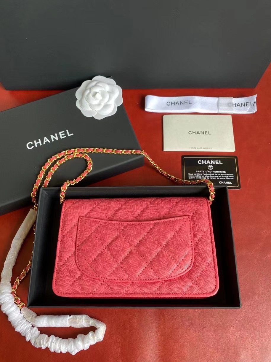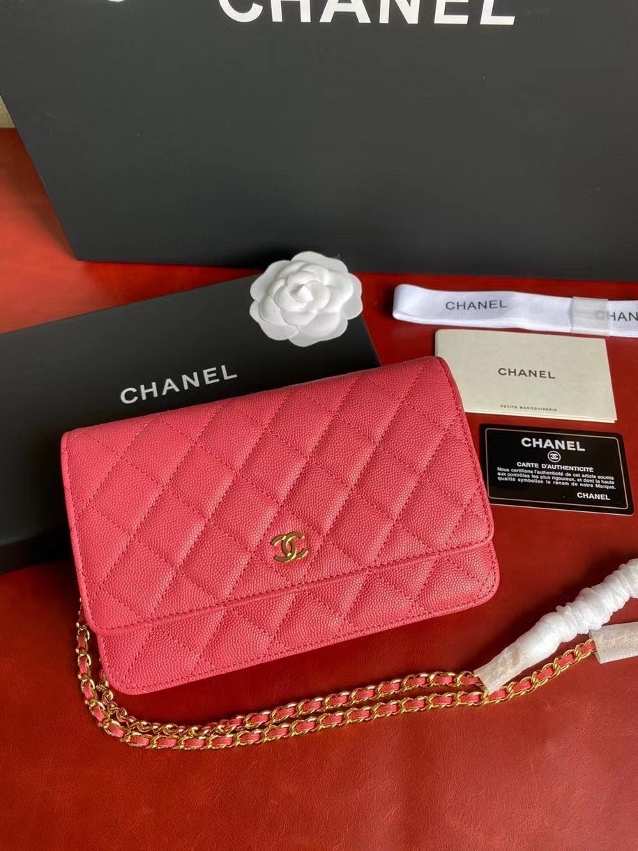CHANEL經典菱格紋雙C粒面牛皮WOC 桃紅