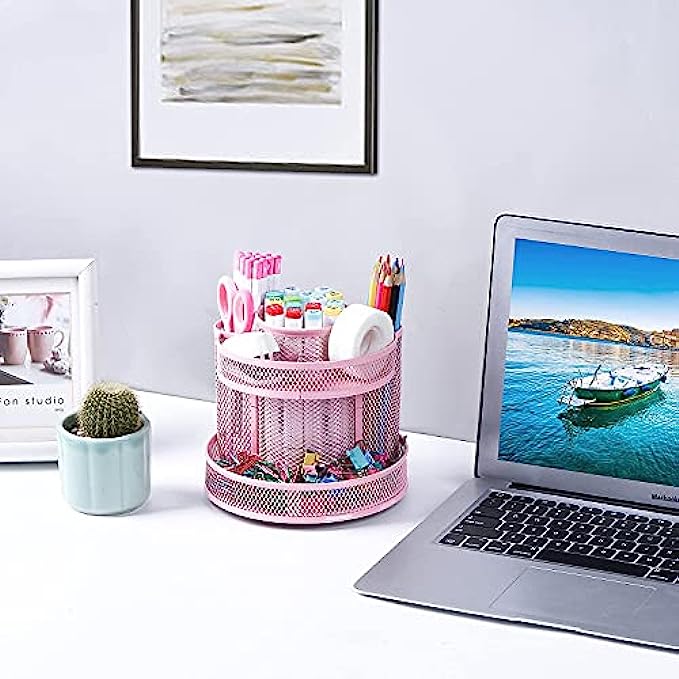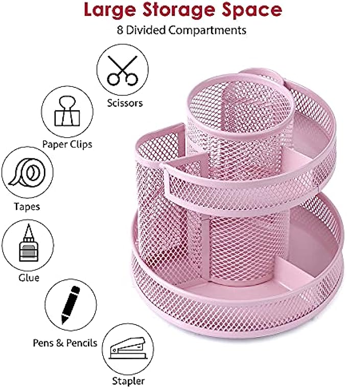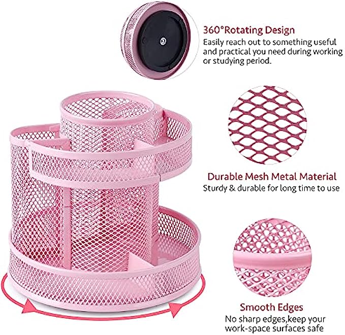 Cute Rotate Desk Organizer, Kawaii Mesh Desk Accessories Pen Holder Stationery Carousel, Spinning Pencil Storage Caddy Tray for School, Home, Office Supplies - Pink