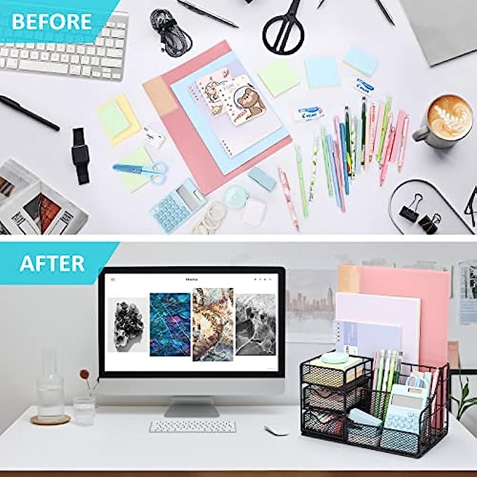 • 【Space saving modern design】Mesh design allows you to easily find anything you need. Our desktop organizer has unique 2 sliding drawers, Perfect for storing your office gadgets such as sticky notes, rulers, business cards, small tapes,small clips, etc. Let you stay away from messy desktop and keep organized.