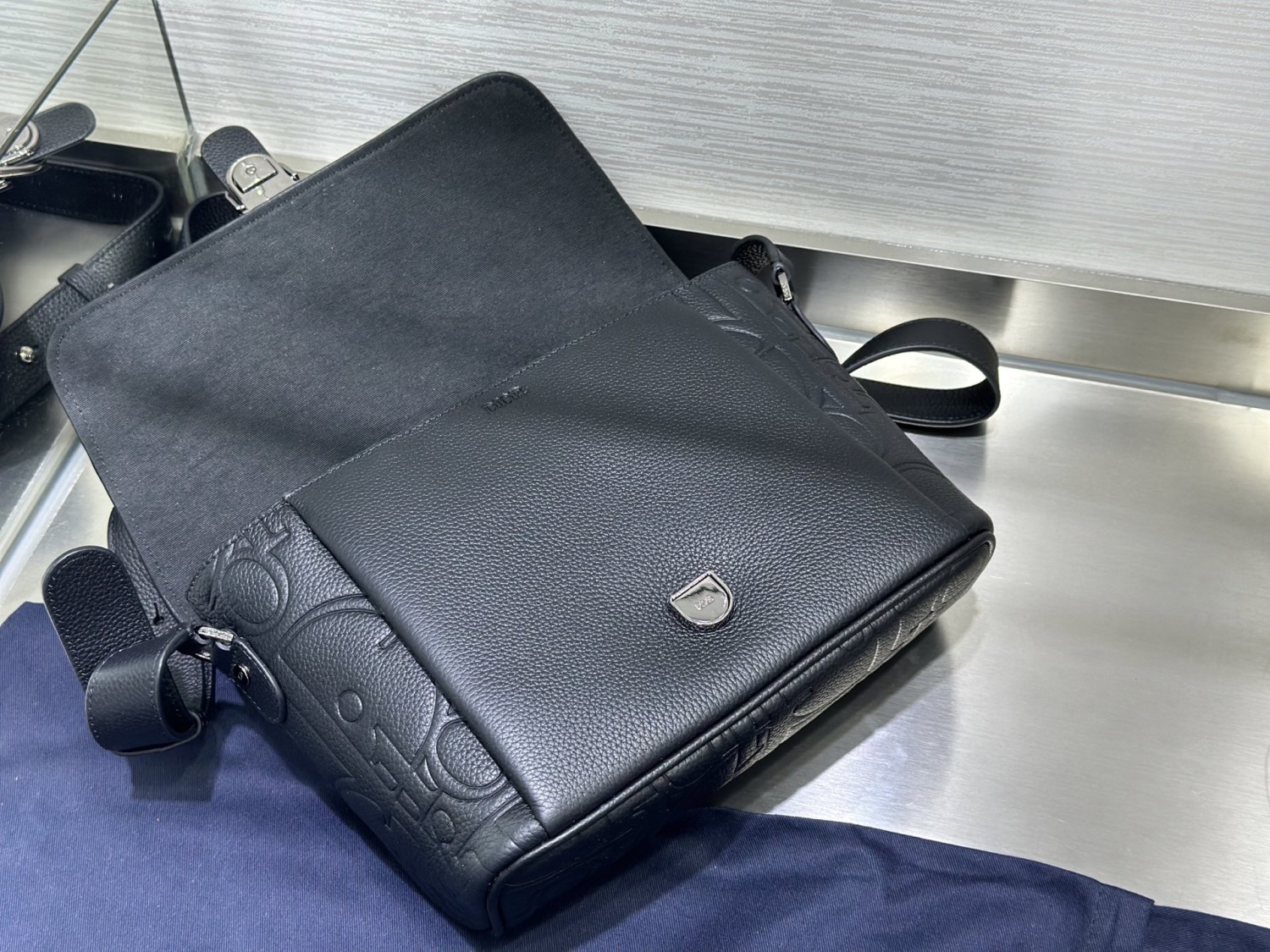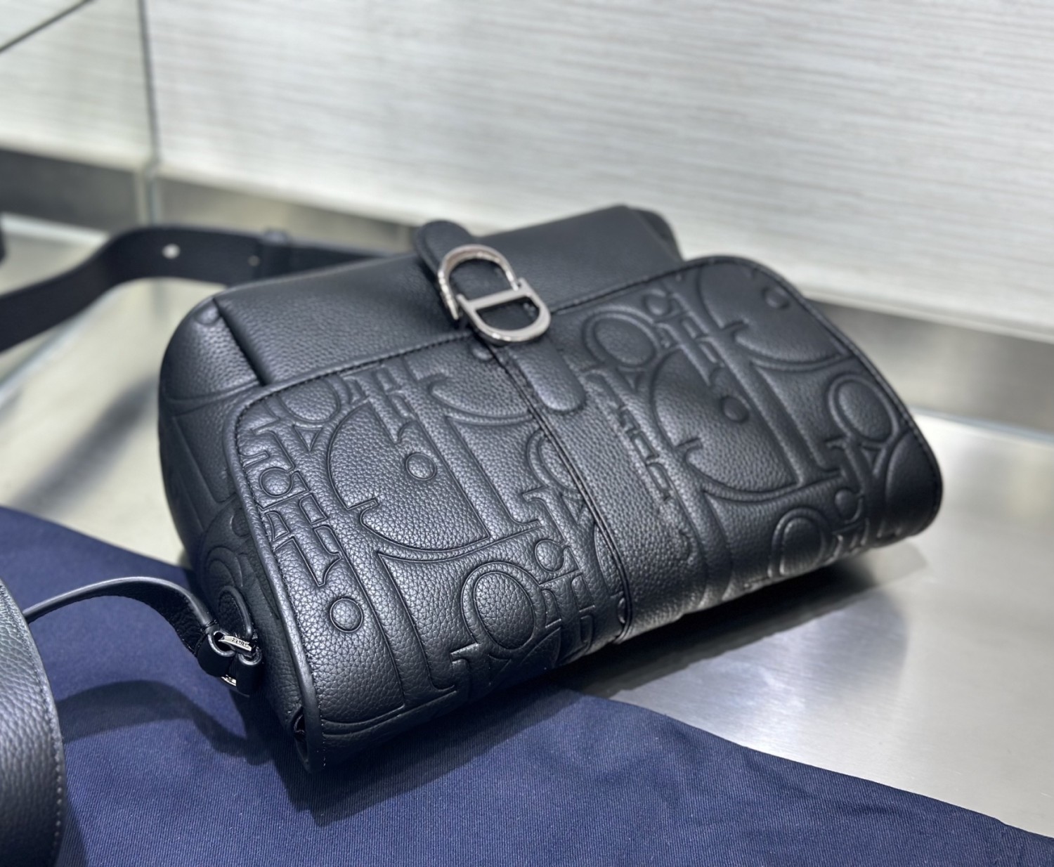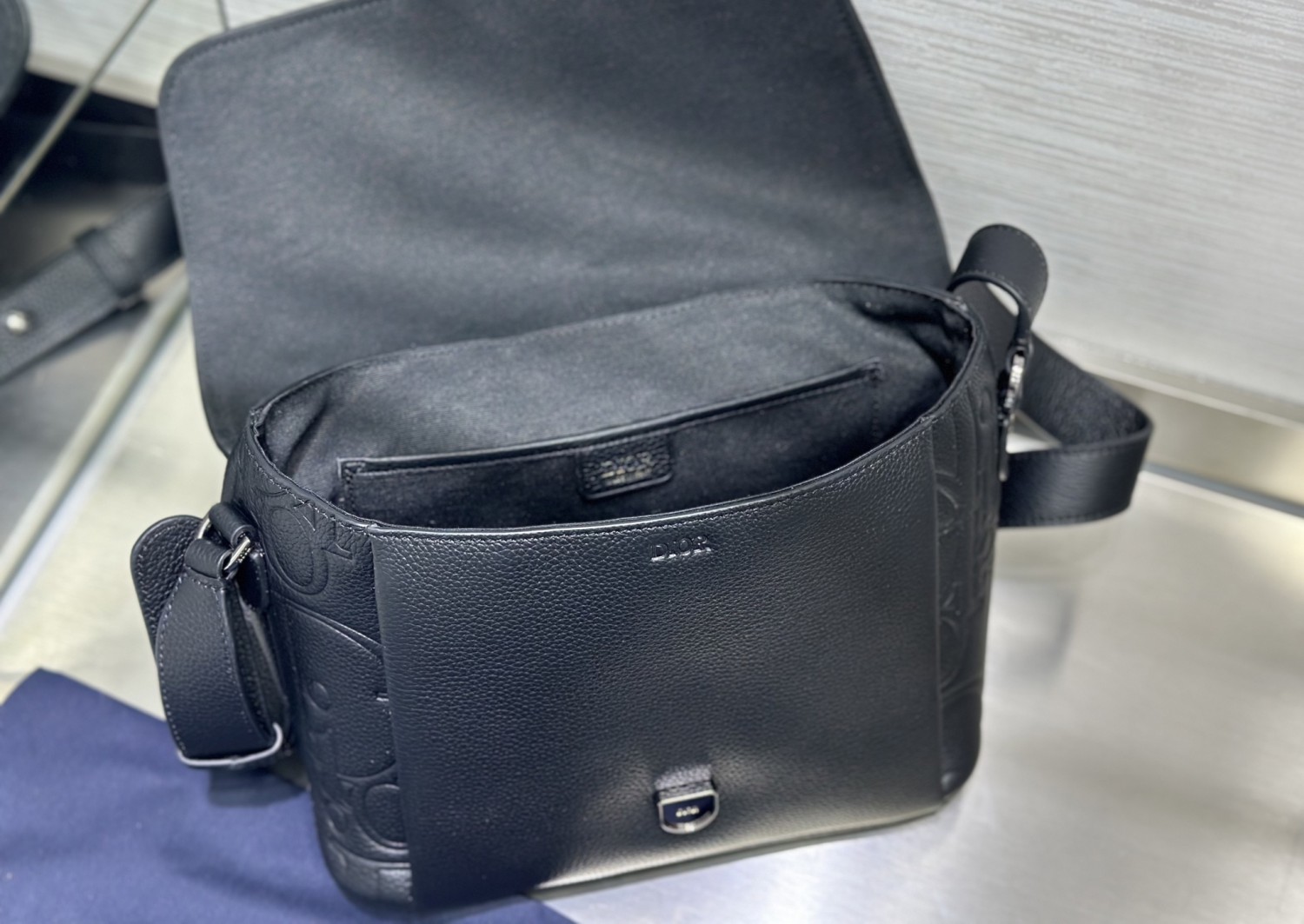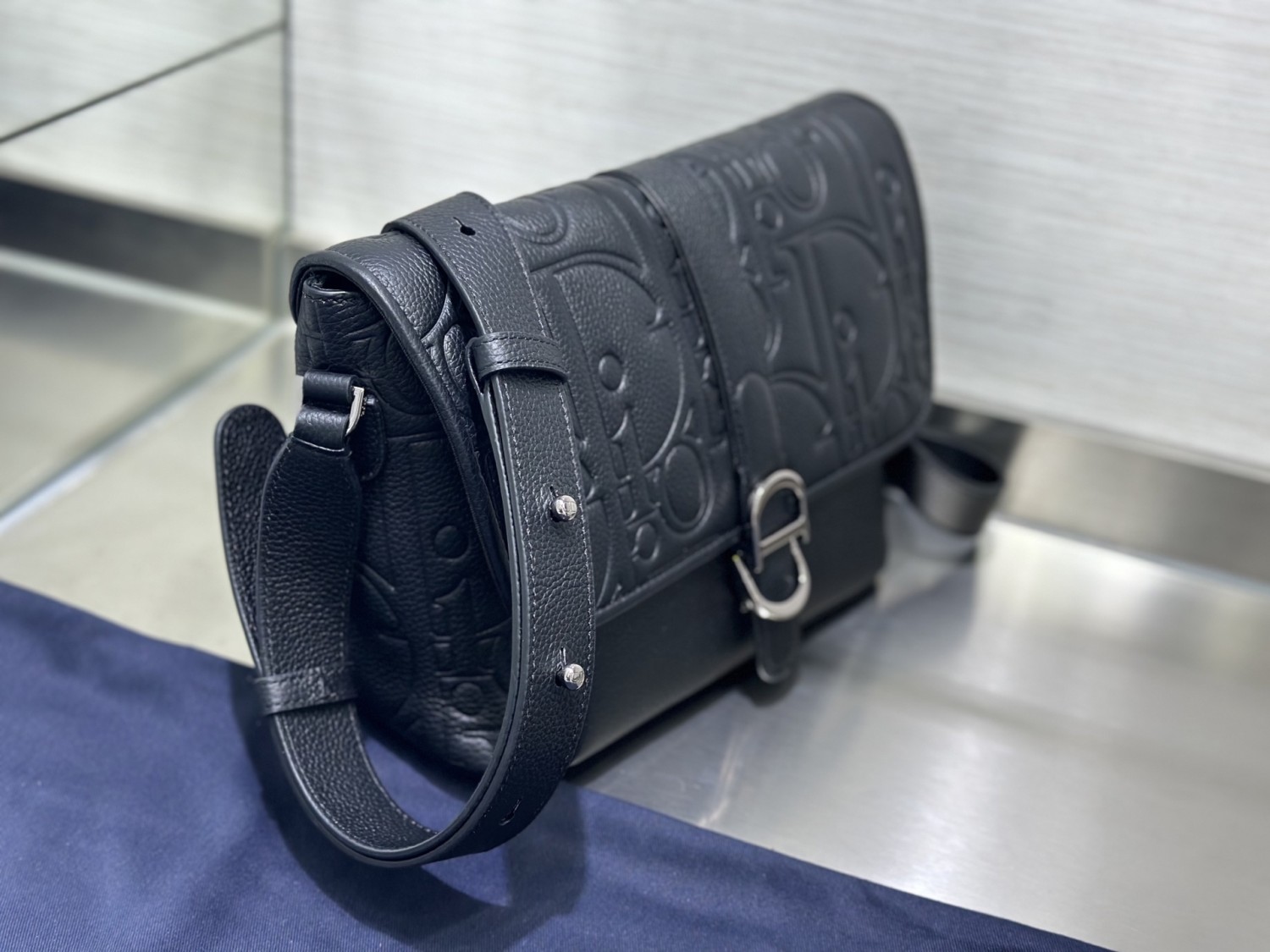 【DIOR】黑色壓紋郵差包|立體字母皮革 × 銀扣細節 × 寬版肩背帶