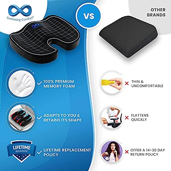 Everlasting Comfort Seat Cushion Pillow for Office Chair - Sit Longer, Feel Better - Butt, Tailbone, Back, Coccyx, Sciatica Memory Foam Cushions - Computer Desk Pain Relief Pad