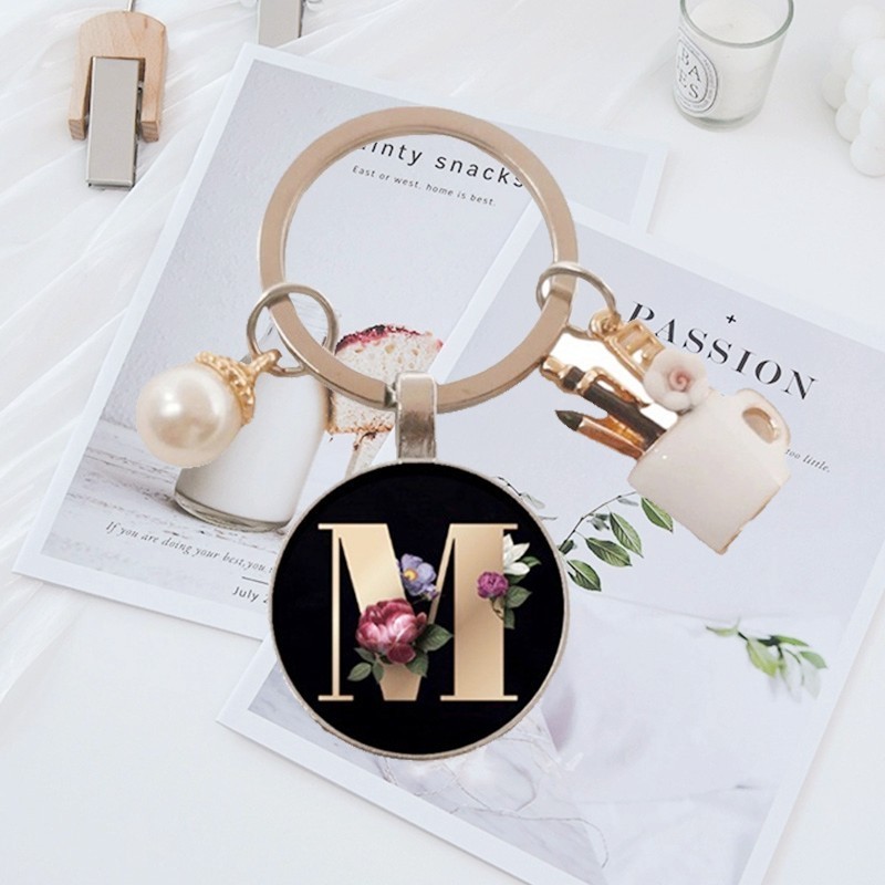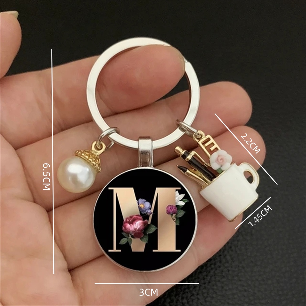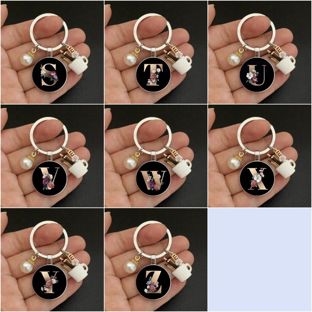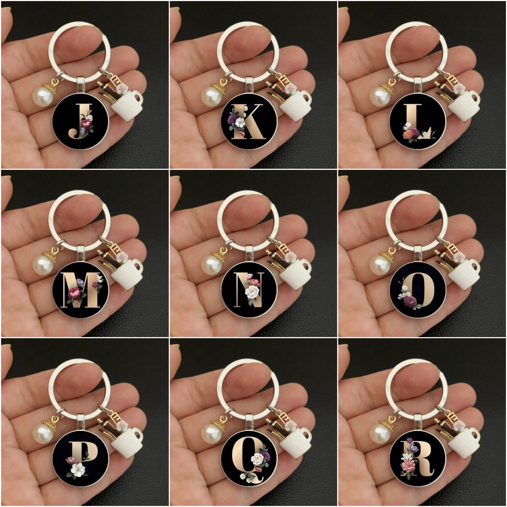 Fashion Charm Enamel Pen Holder for Teacher's Day Gifts Elegant Pearl A-Z Letter Pattern Glass Cabochon Key Ring