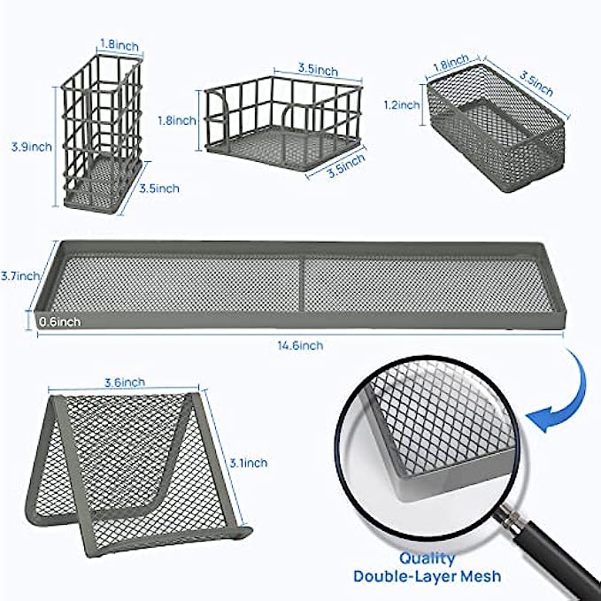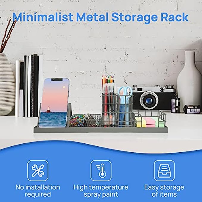 Grey Desk Organizer for School and Office - 7 Piece Desk Accessories Set- Pencil Holders, Clip Storages, Sticky Note Tray and Phone holder, Customizable Storage - Office Supplies Stationery Décor