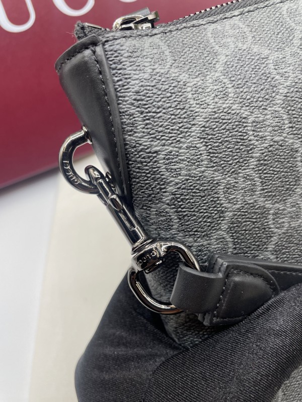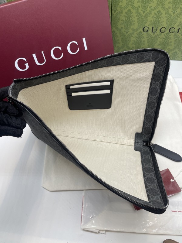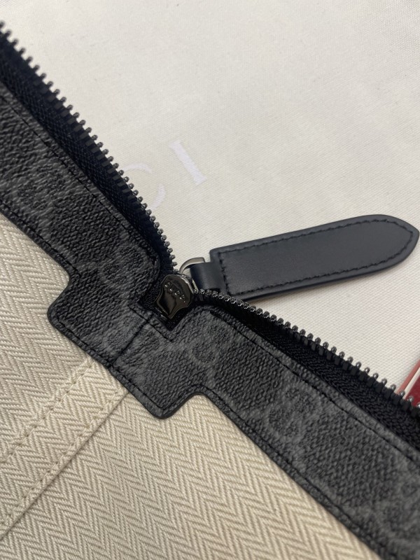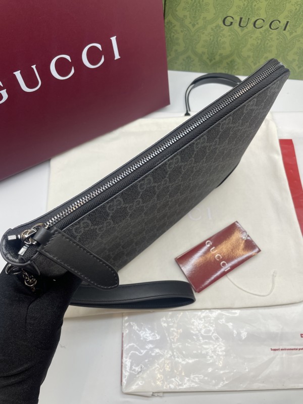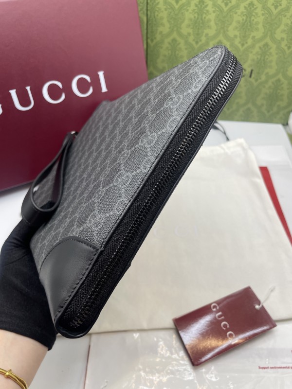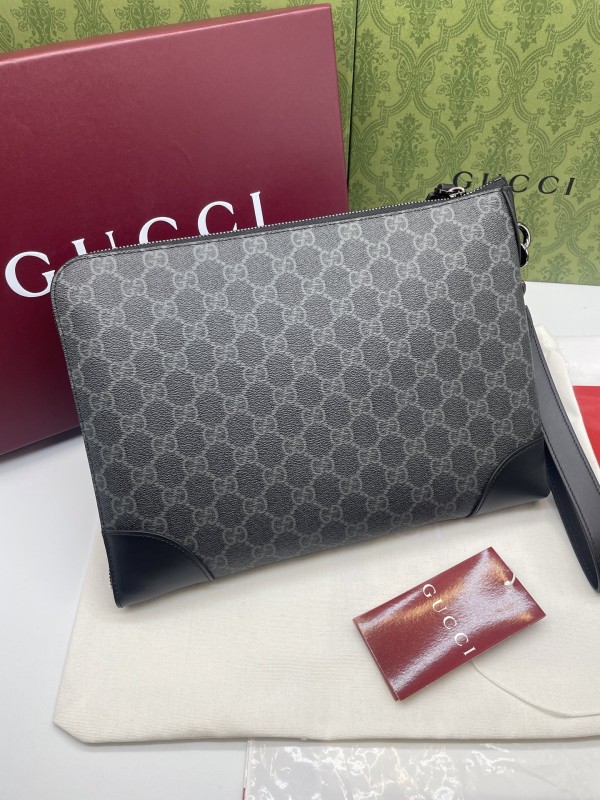 【GUCCI 古馳】GG Supreme 灰黑拼皮手拿包|低調雙G印花 × 防潑水帆布 × 商務簡約風