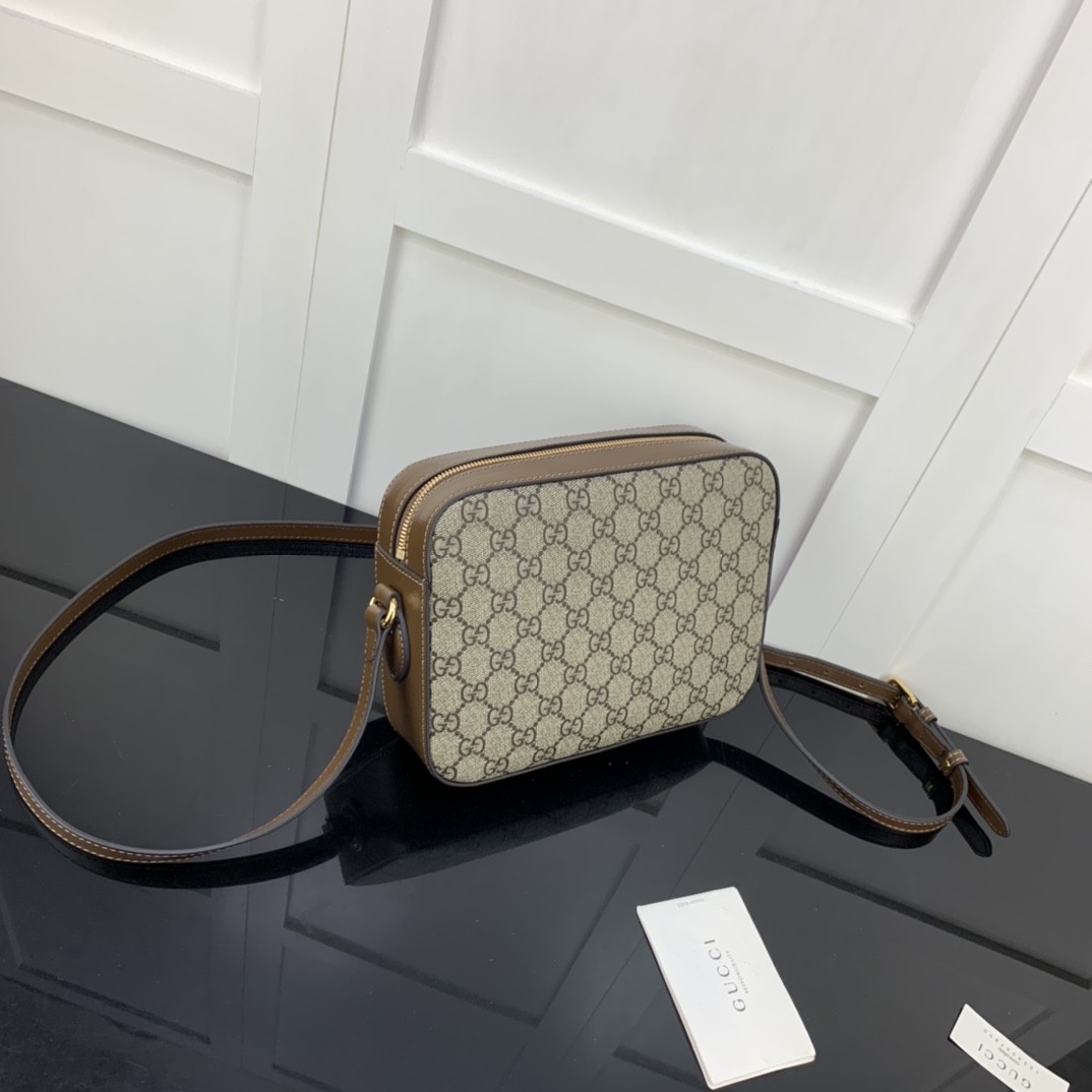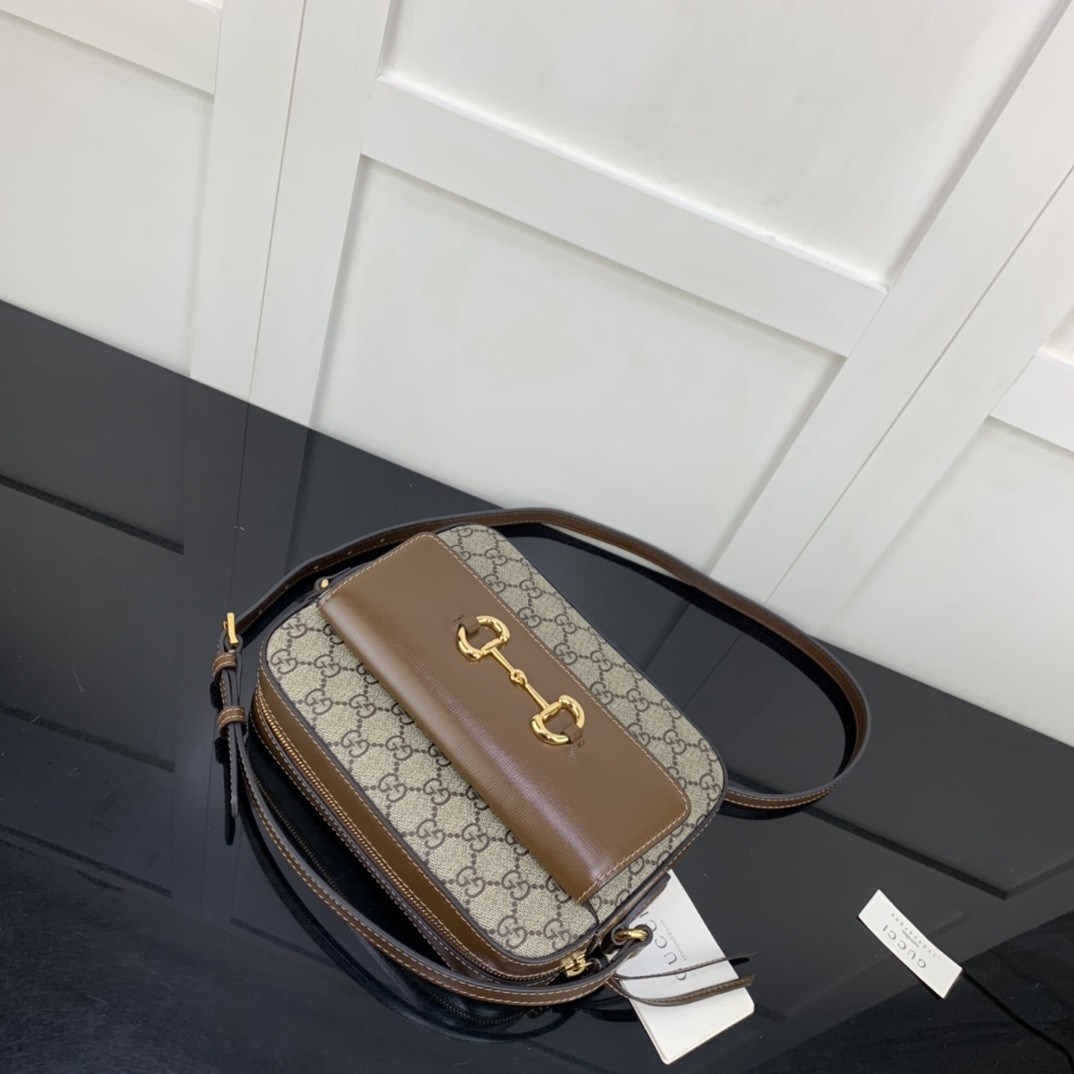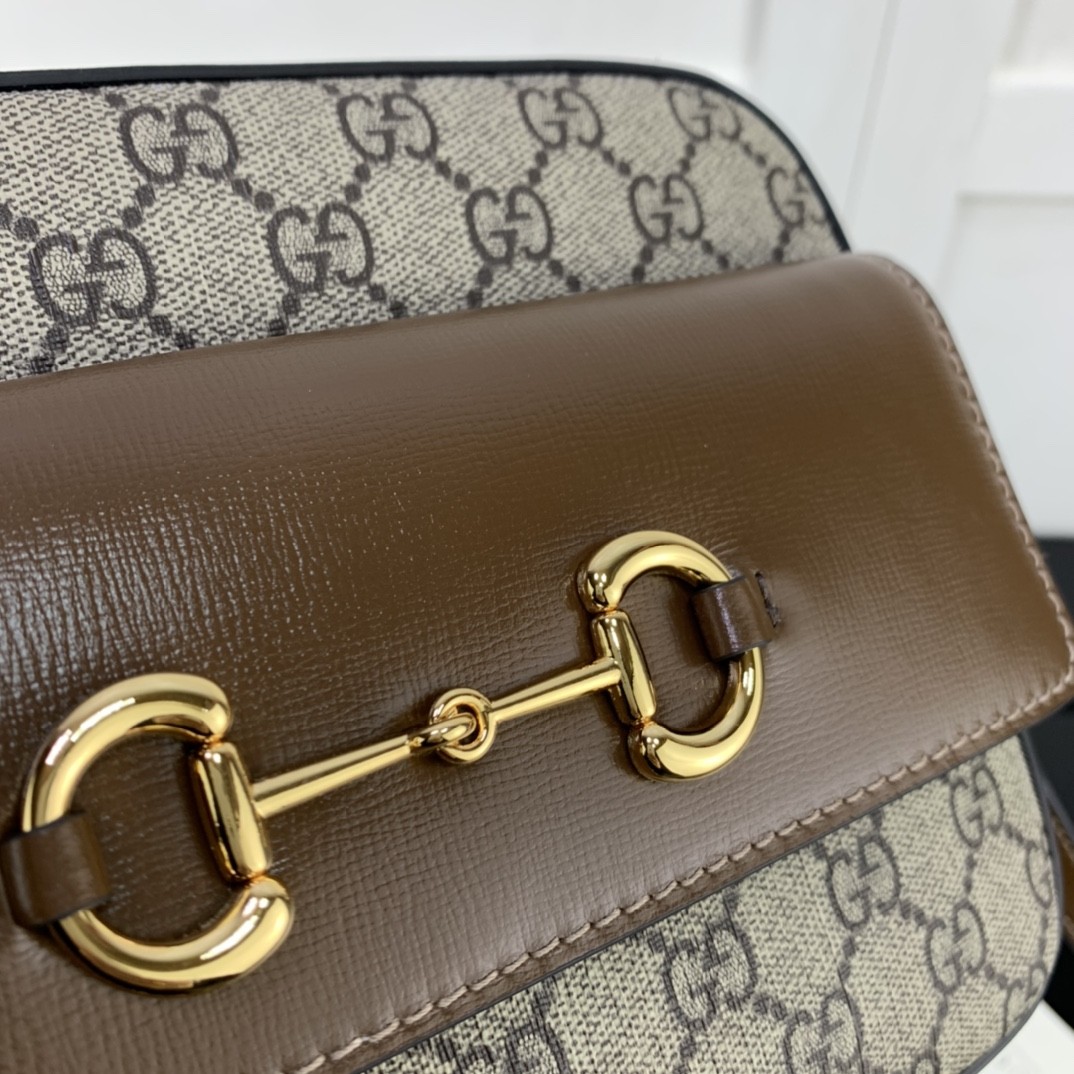 【GUCCI 古馳】Horsebit 1955 GG Supreme 相機包|馬銜扣 × 焦糖皮革拼接 × 經典老花設計
