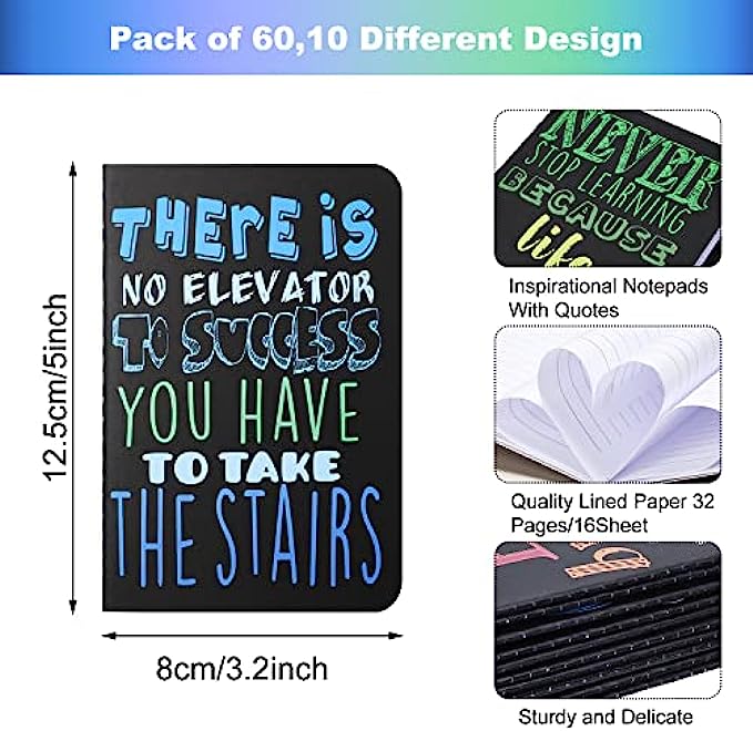 Inspirational gifts Notepads Mini Motivational Journal Notebook Bulk Small Pocket Notepads for School Office Home Travel Gift Supplies, 10 Styles(Bright Style,60 Pieces)