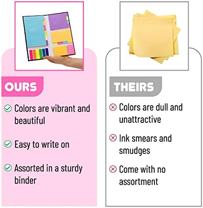 Each sticky notes set includes 60 Ruled (3.8x6’’), 40 Dotted Notes (3x3.8’’), 40 Blank (2.6x3.5’’), 60 Orange and Pink, 150 Neon Color Index Tabs, 410 Total Tab Divider Notes