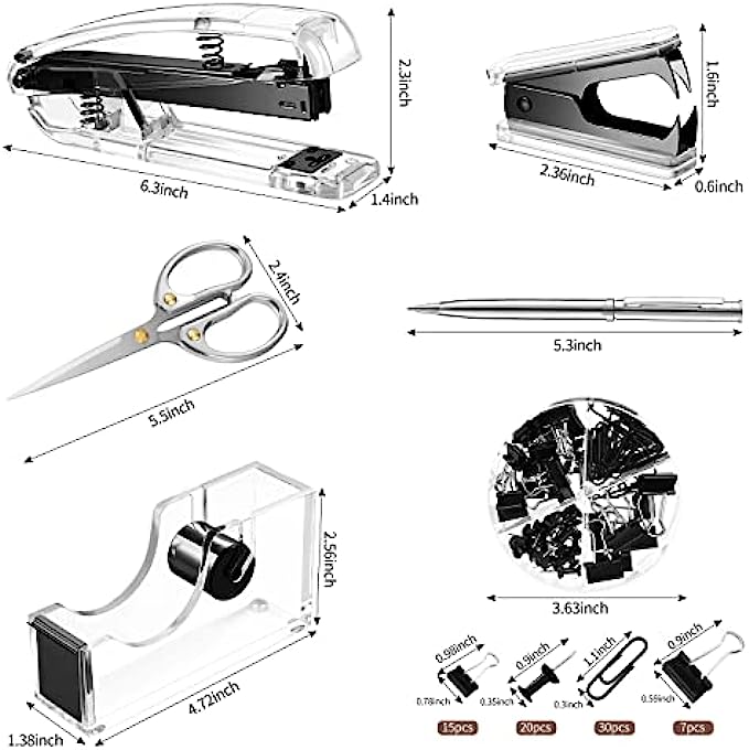 • Thoughtful design: there is a non-slip mat on the bottom of the stapler; The stapler is about 6.2 x 2.3 x 2.3 inch, tape dispenser is about 4.7 x 2.7 x 1.2 inch, the staple remover is about 2.3 x 1.6 x 0.4 inch, the scissor is about 5.5 x 2.4 inch, the pen is about 5.3 inch; They can be put in the drawer at will, will not take up space; The clip is equipped with a lattice storage box for easy storage; You can put them in your handbag or schoolbag and take them with you anywhere
