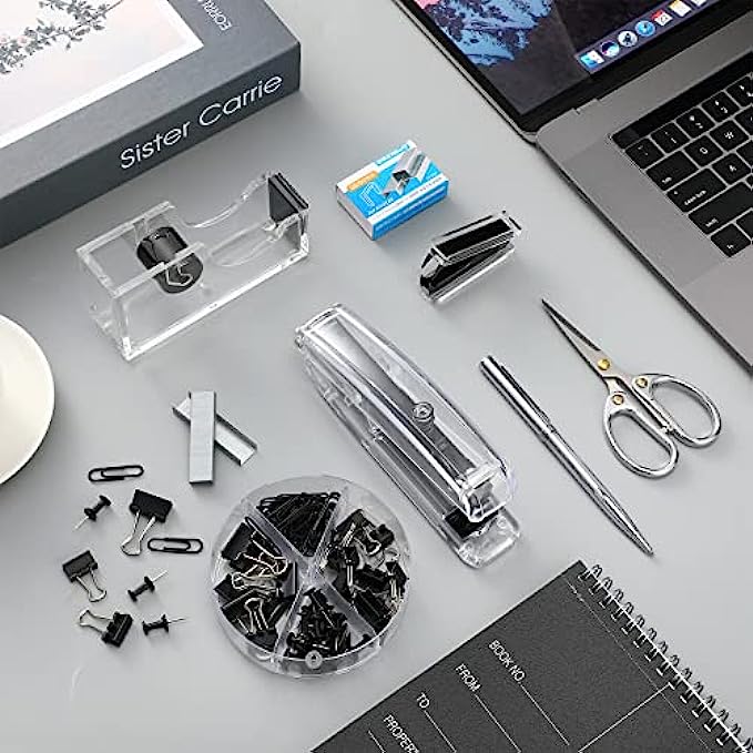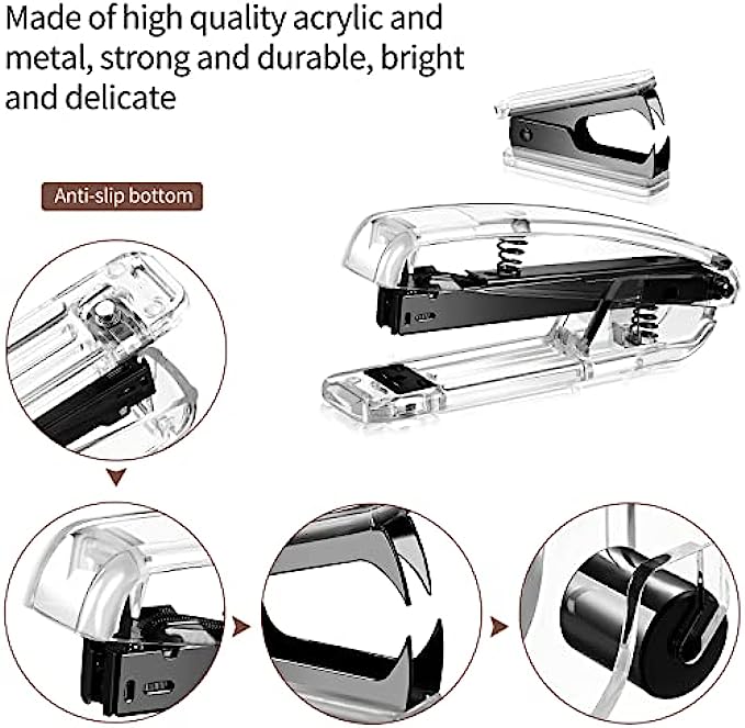 • Quality materials: the stapler, tape dispenser and stapler remover are mainly made of acrylic and metal, clear and bright; Touch smooth and comfortable, not easy to break, durable, elegant and beautiful, very suitable for desktop office supplies
