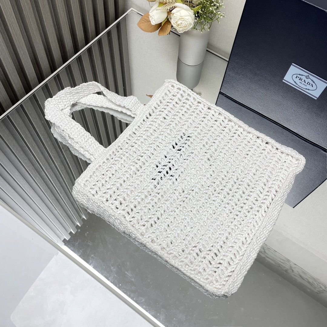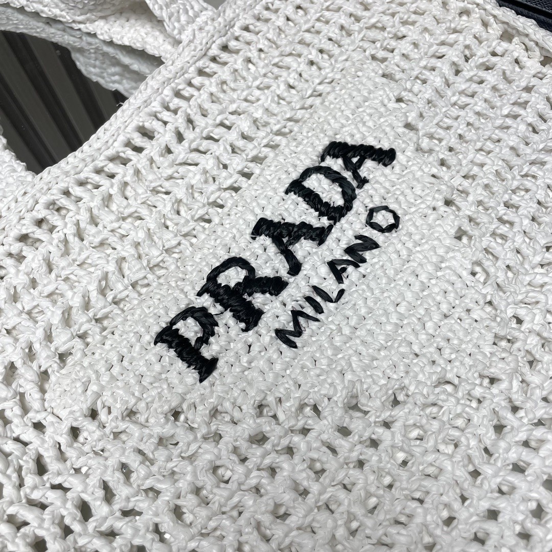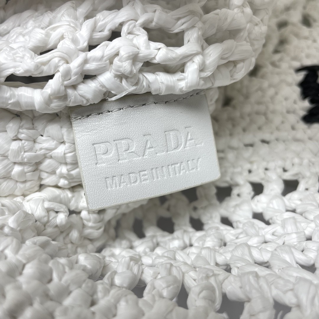 【PRADA 普拉達】Raffia 編織托特包|純白 × 黑色Logo × 手工鏤空夏日包