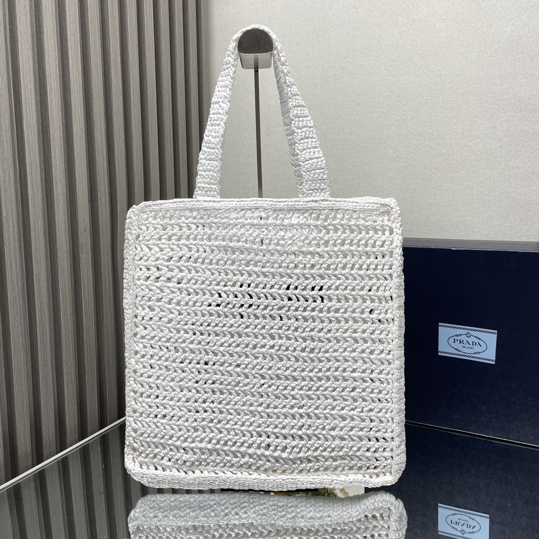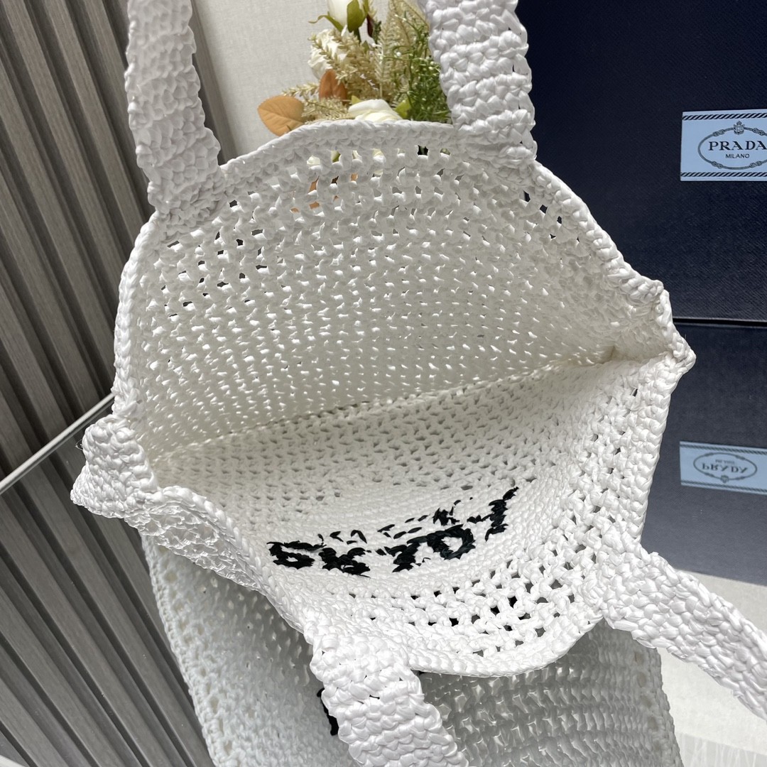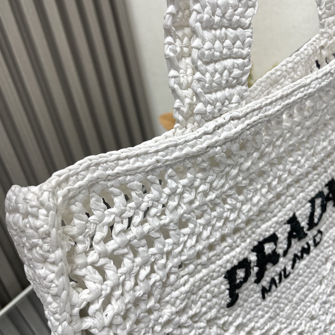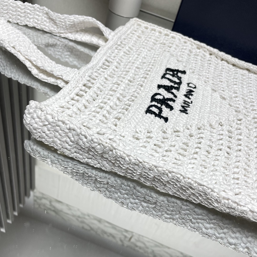 【PRADA 普拉達】Raffia 編織托特包|純白 × 黑色Logo × 手工鏤空夏日包