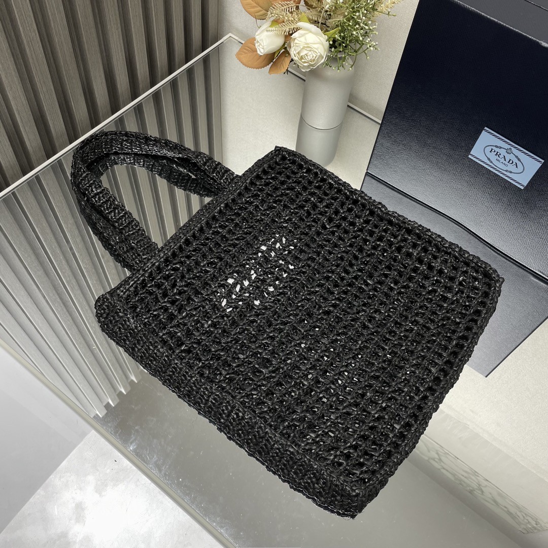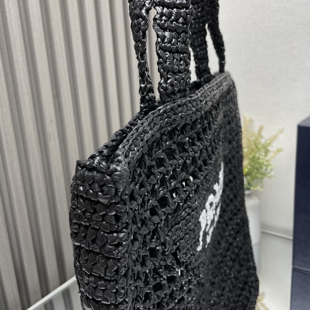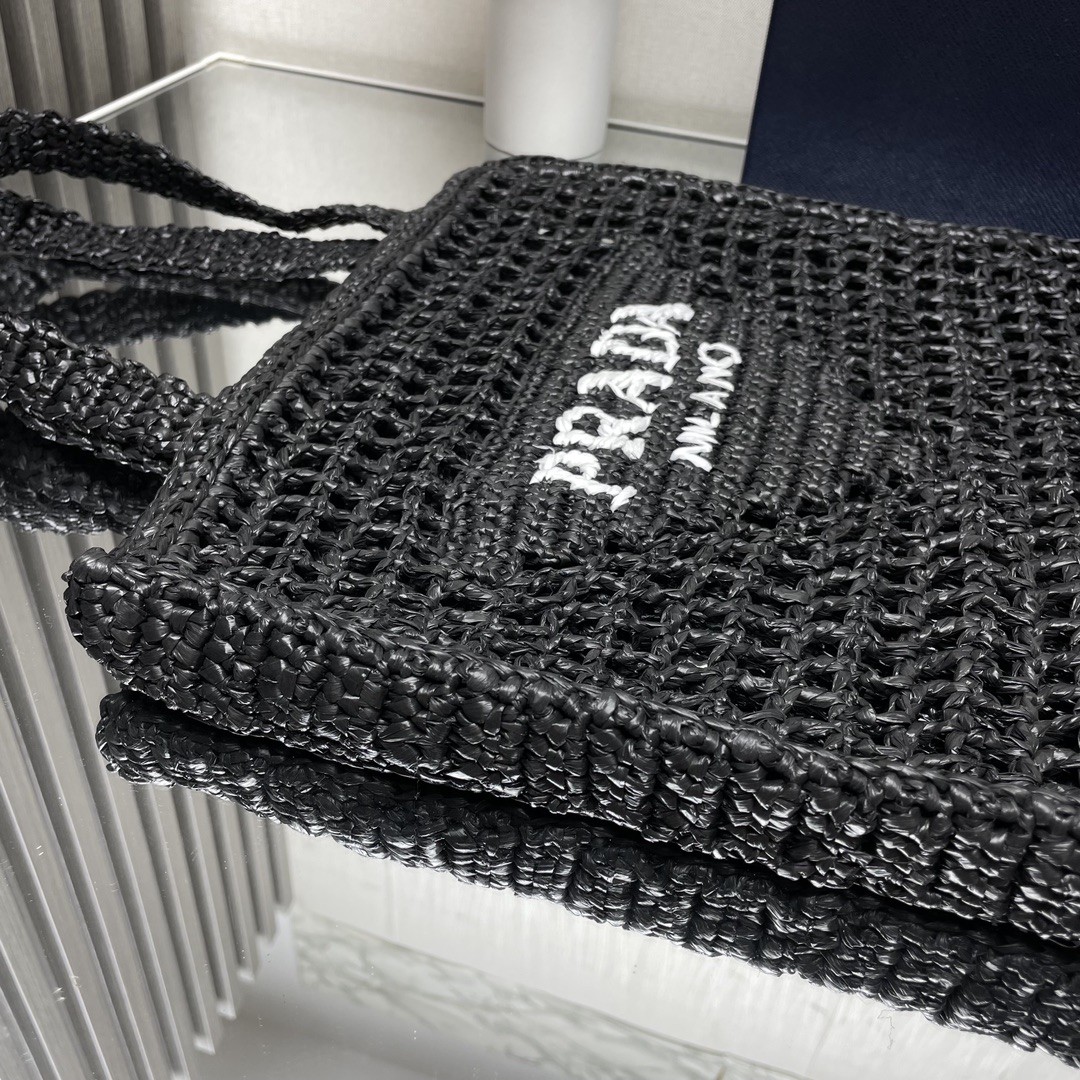 【PRADA 普拉達】Raffia 編織托特包|黑色 × 白Logo × 手工鏤空度假包