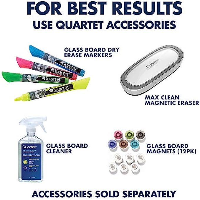 ACCESSORIES INCLUDED – Measures 96" x 48". Comes with removable accessory tray, 1 marker and 2 high power glass board magnets. For best results use Quartet Glass Board Accessories, sold separately.