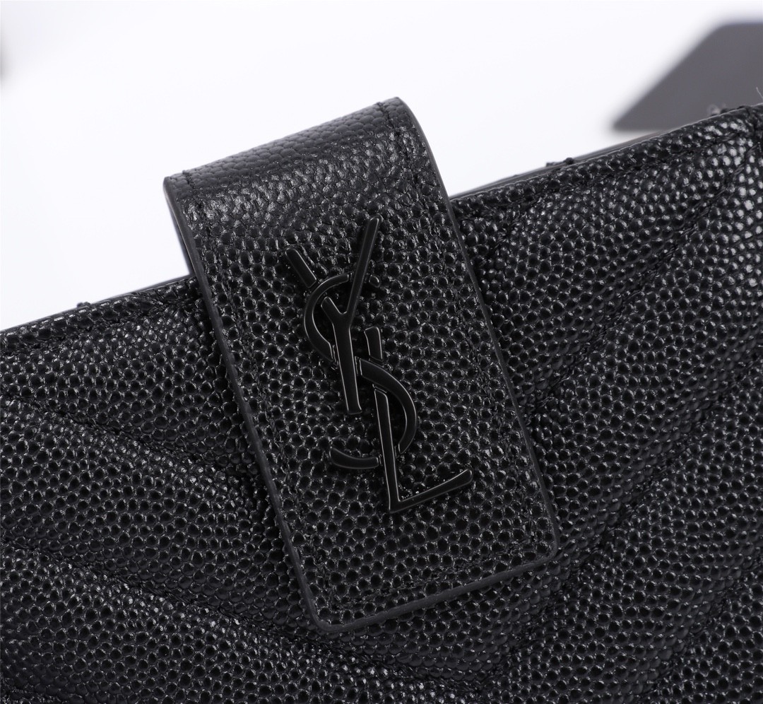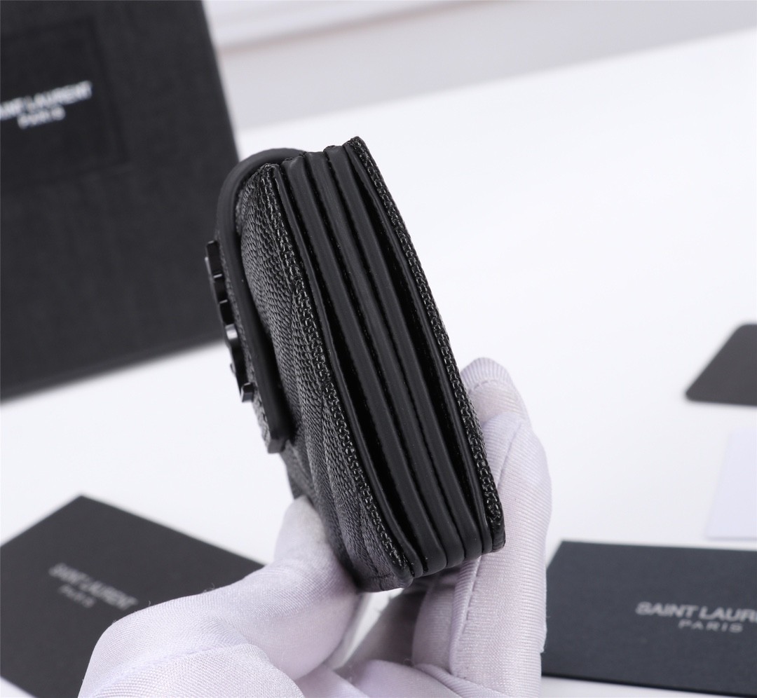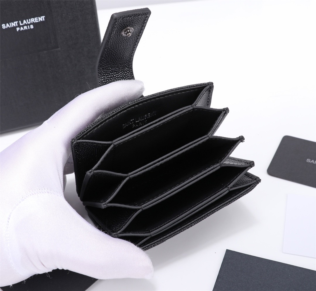 【Saint Laurent 聖羅蘭】風琴式短夾(純黑款)|荔枝壓紋皮革、金色YSL字母Logo、多層收納設計