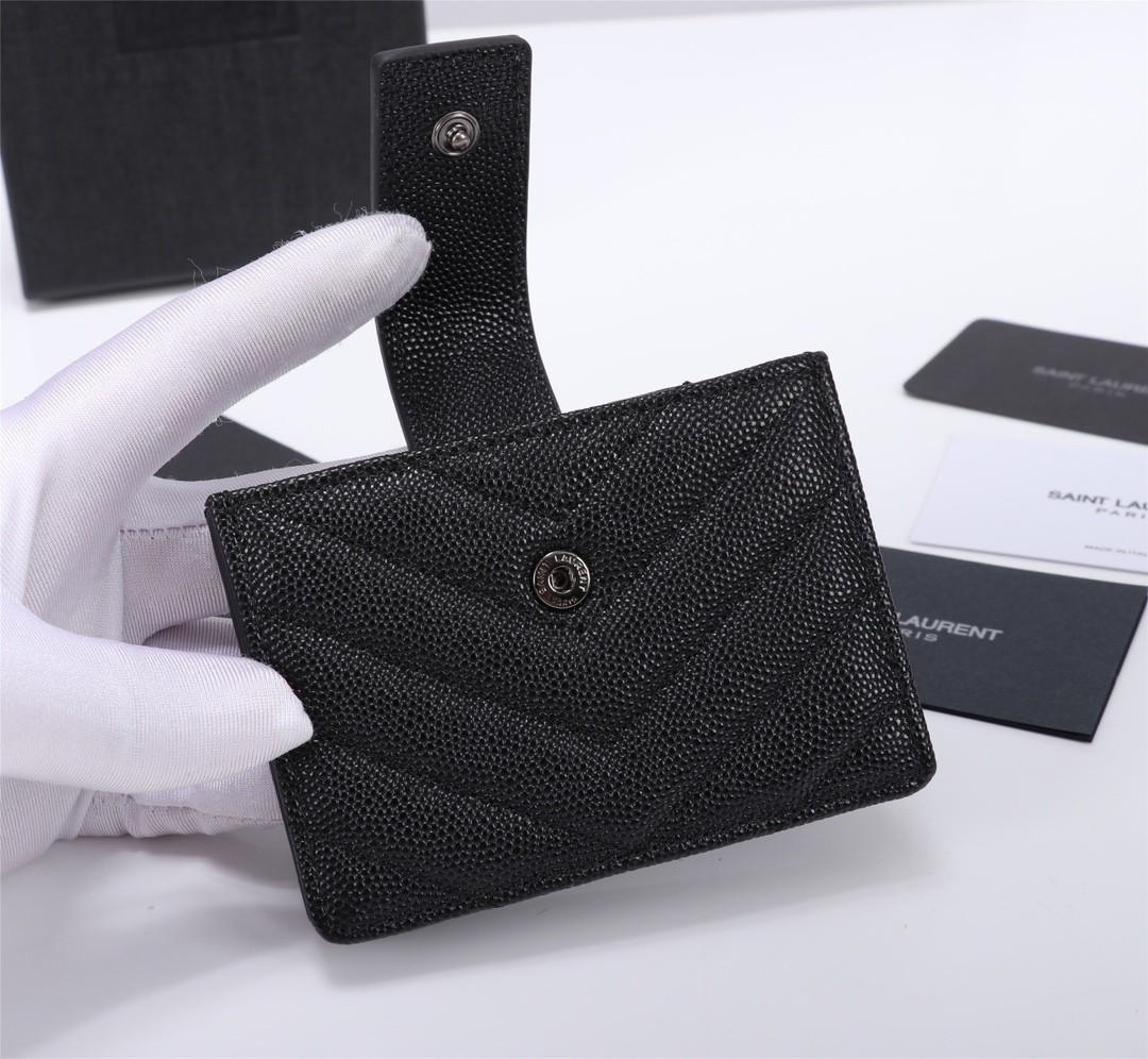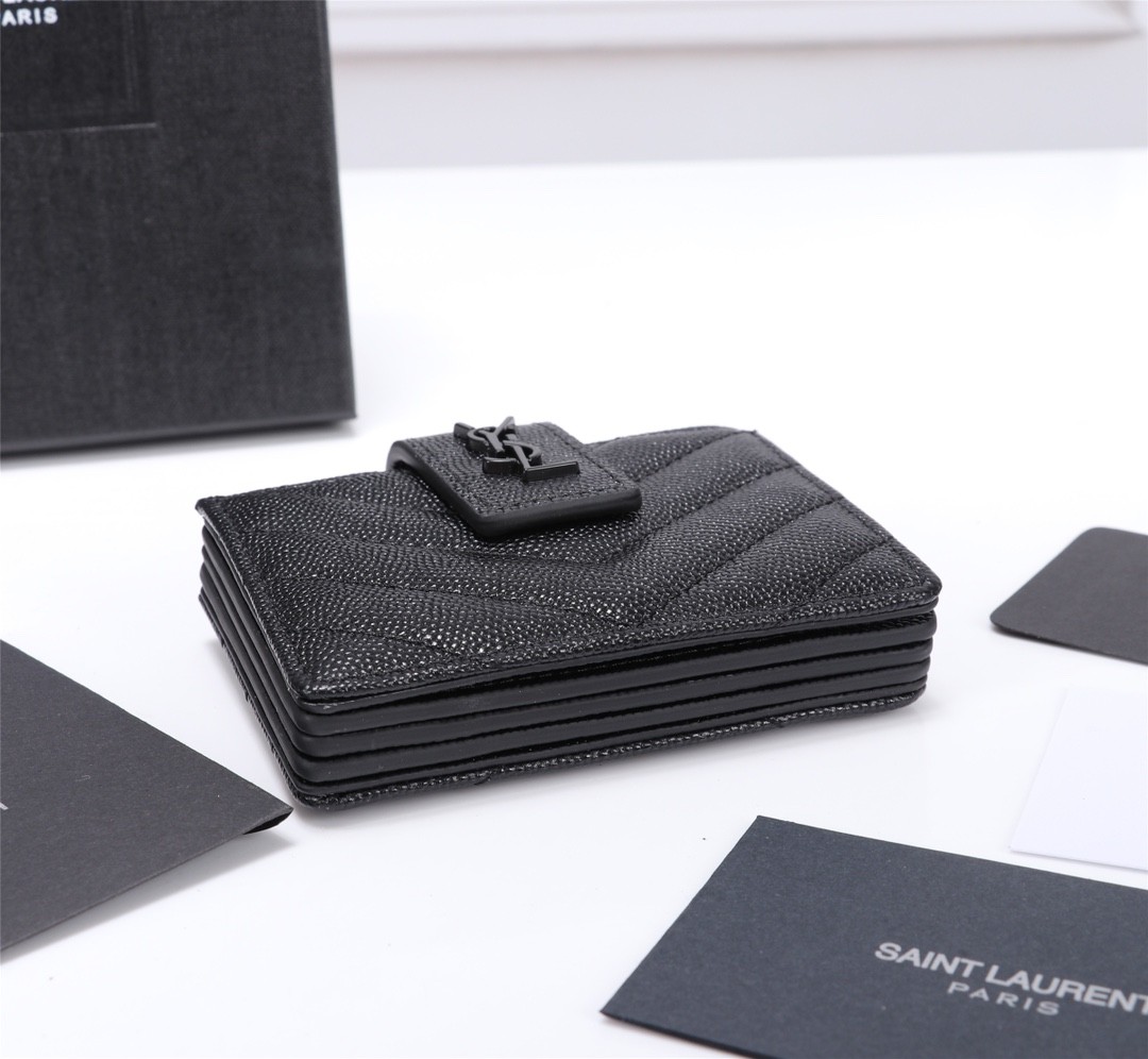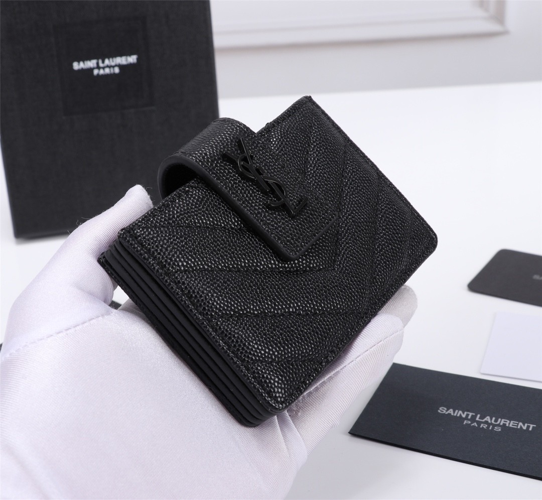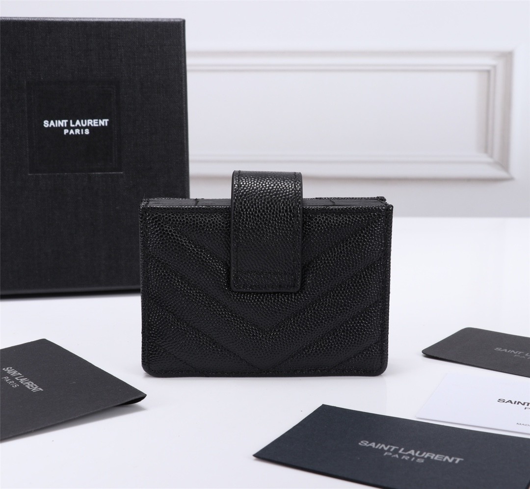 【Saint Laurent 聖羅蘭】風琴式短夾(純黑款)|荔枝壓紋皮革、金色YSL字母Logo、多層收納設計