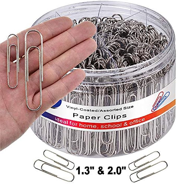 1,【Medium & Large paper clips】: Assort sizes, 500pcs big non skid paper clips, included 350pcs of 1.3 inch paper clip, 150pcs of 2.0 inch paper clips, large size paperclips are perfect for holding more and thicker papers.